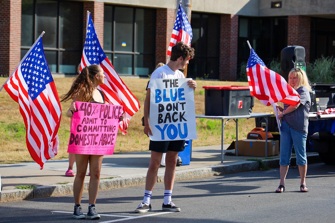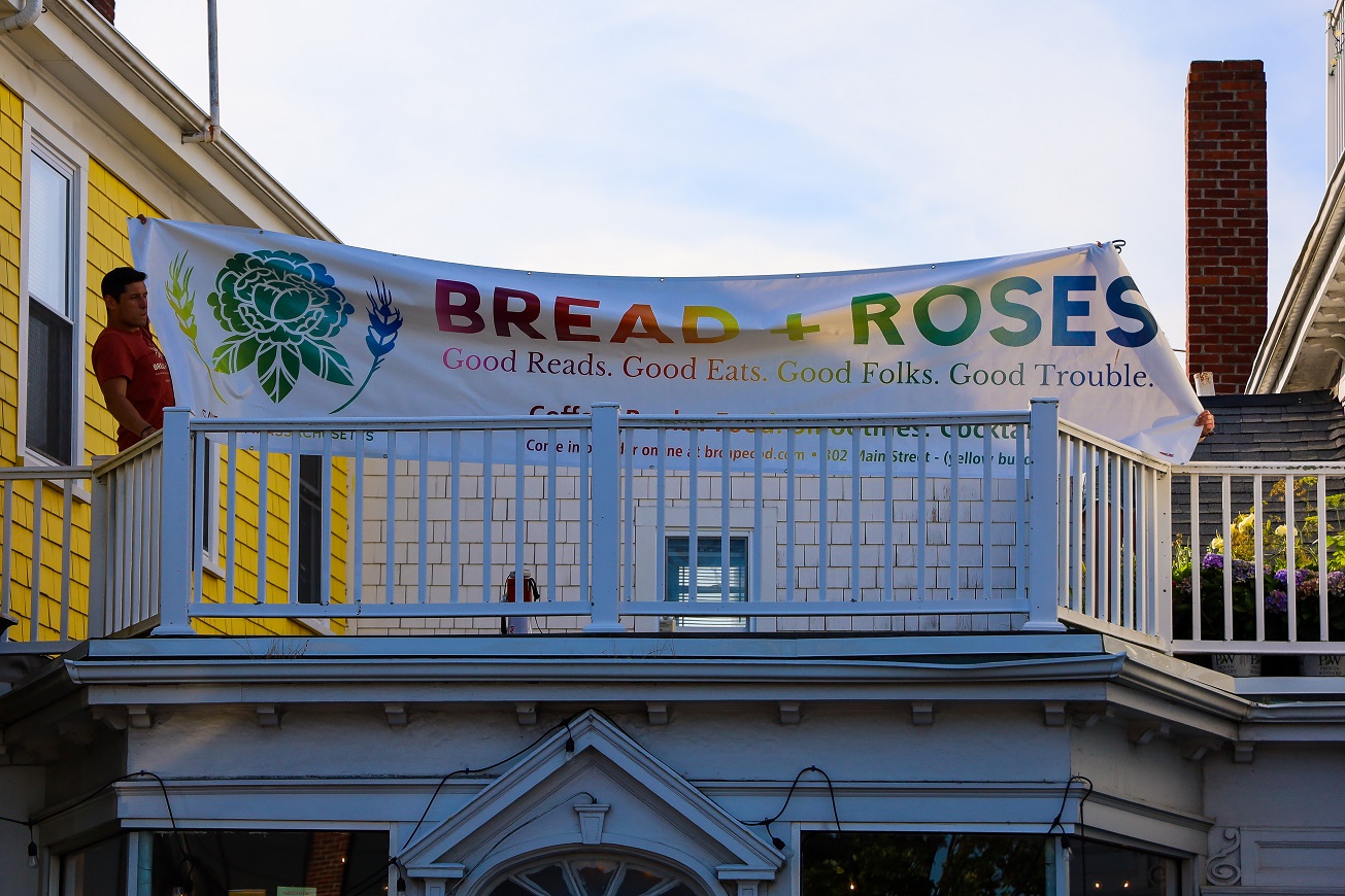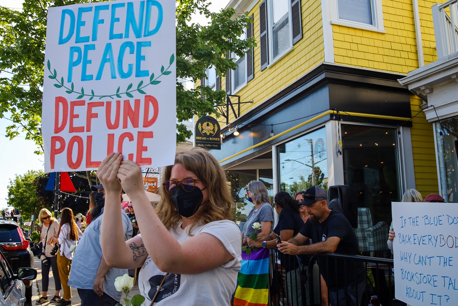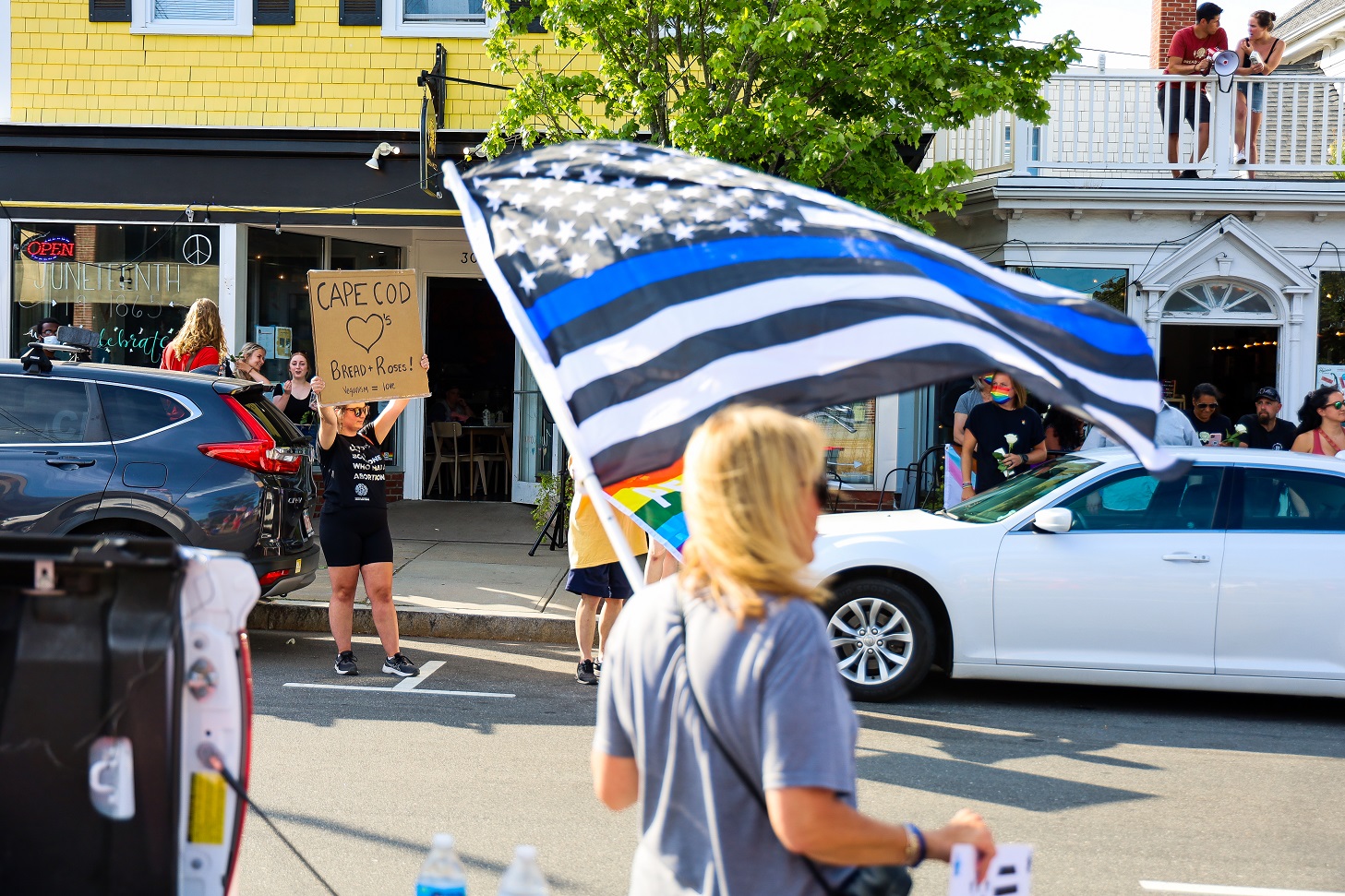 HYANNIS – [HN NOTES] – I was tipped off about a lively protest on Main Street Hyannis, earlier this afternoon. I was told an organization called “Back the Blue” was going to be protesting Bread & Roses, a Hyannis “café, bookshop, and bar.” The beef seemed to be over an anti-police sign hanging inside of the establishment, along with some anti-cop stickers. Unbeknownst to HN, there has apparently been a debate online about the sign and stickers. In response to “Back the Blue” showing up, supporters of Bread & Roses organized a counter-protest of their own.