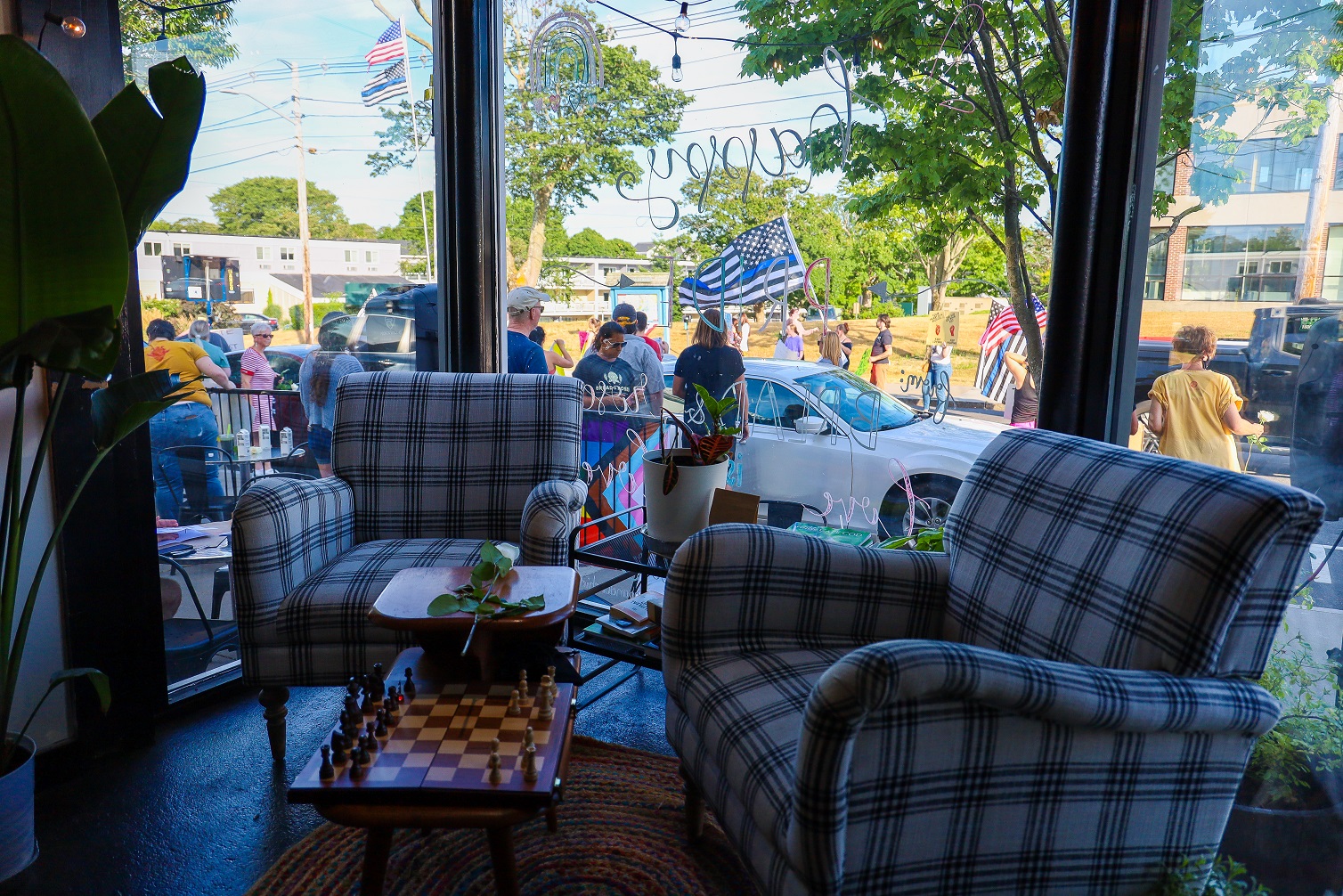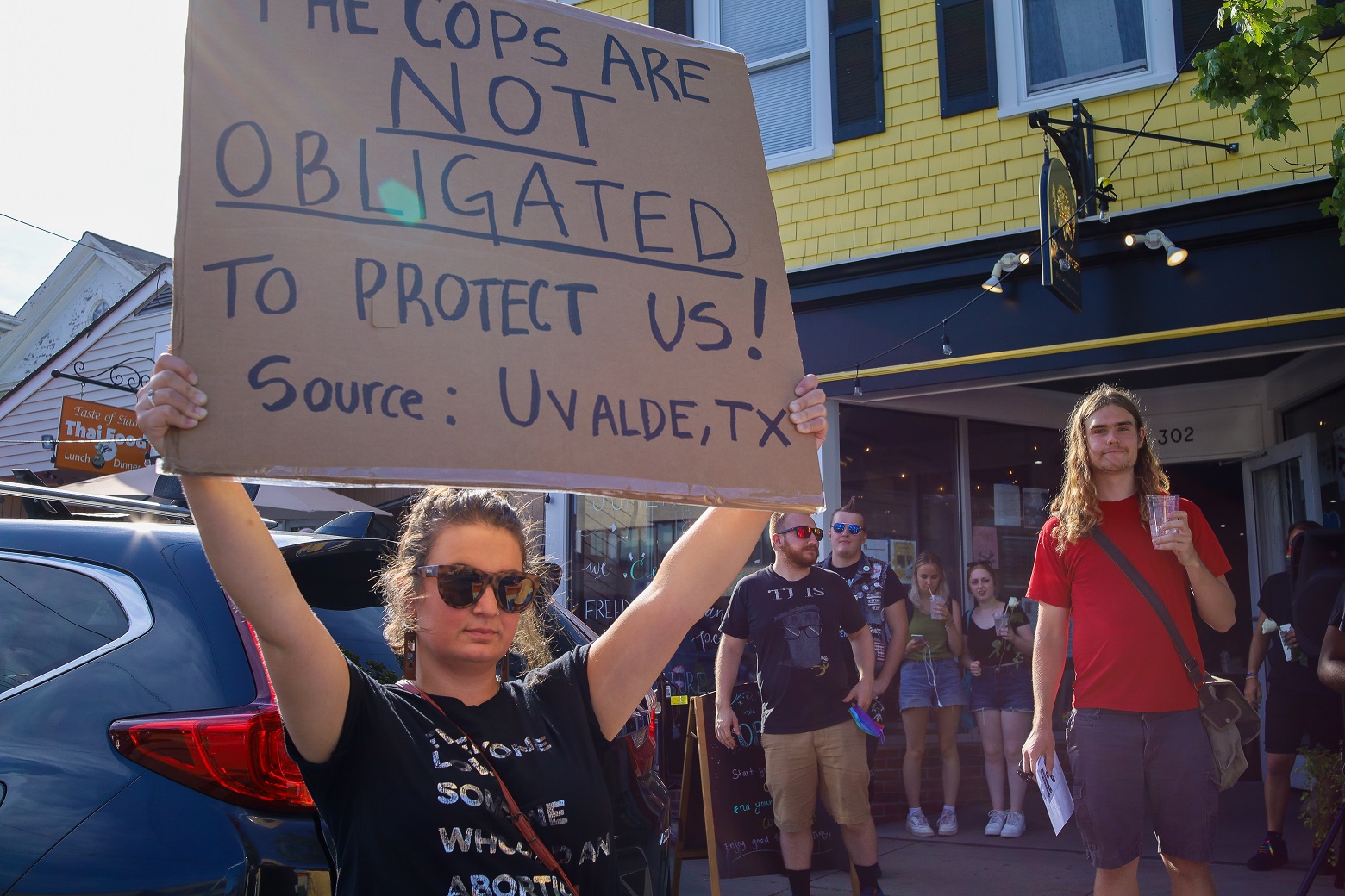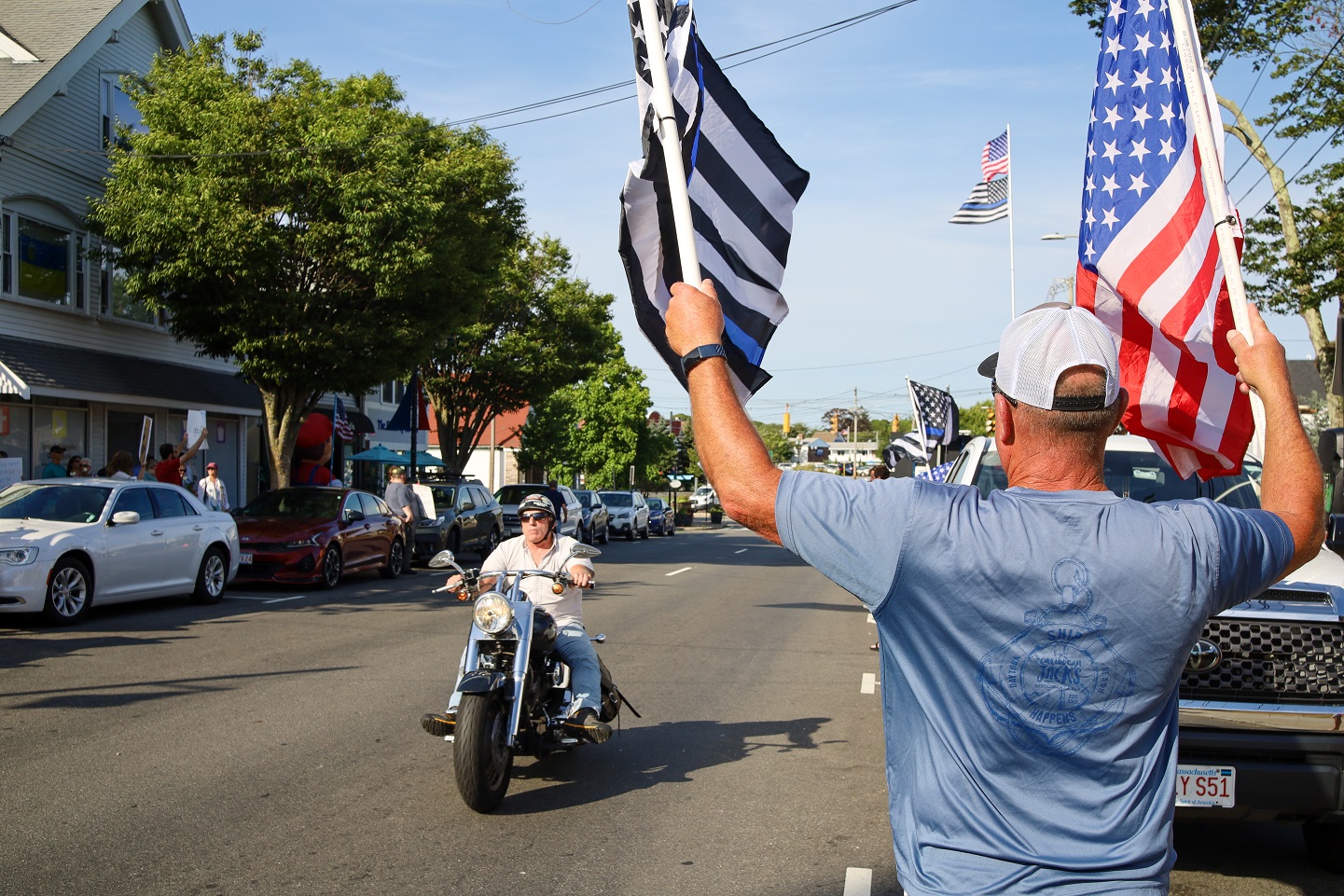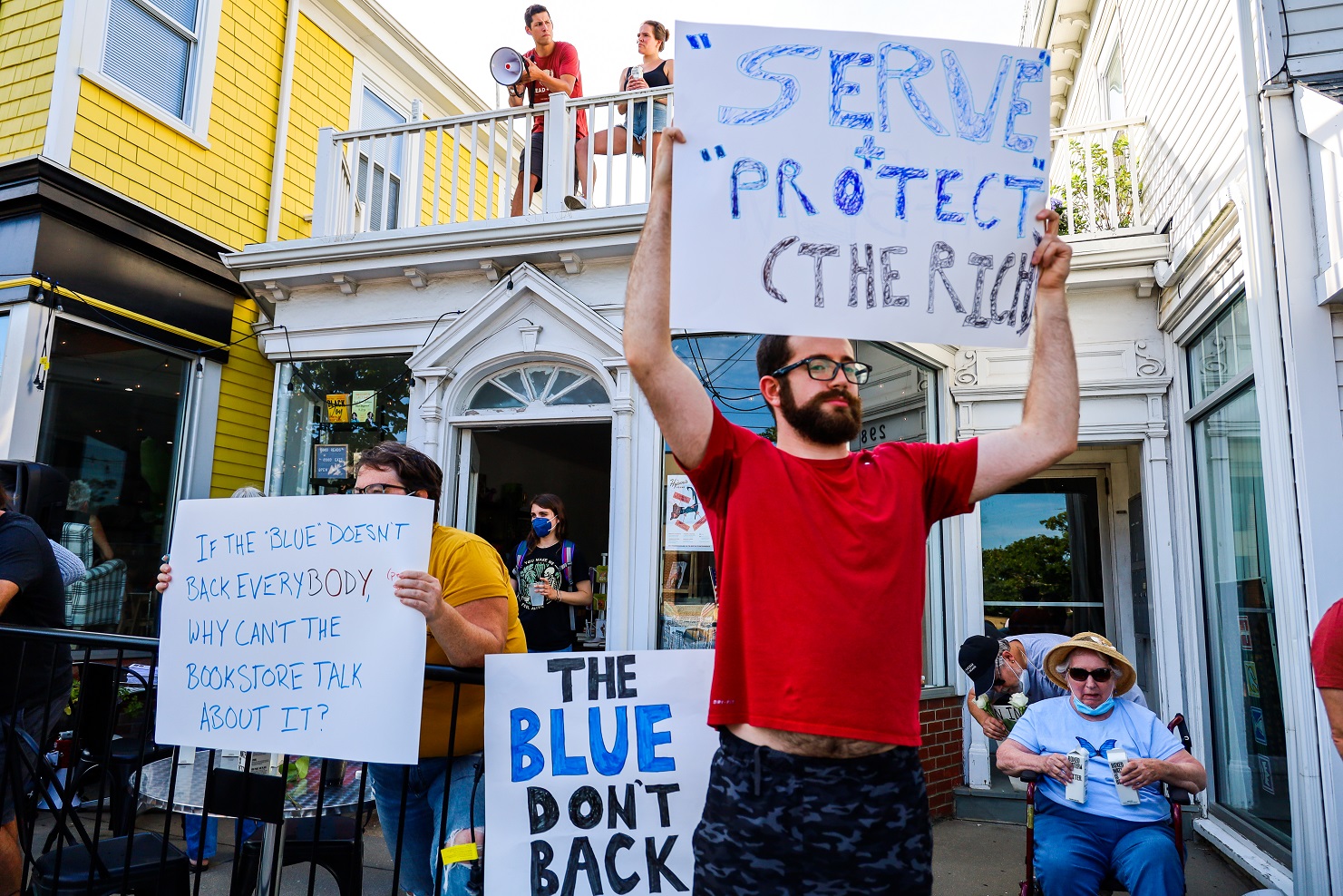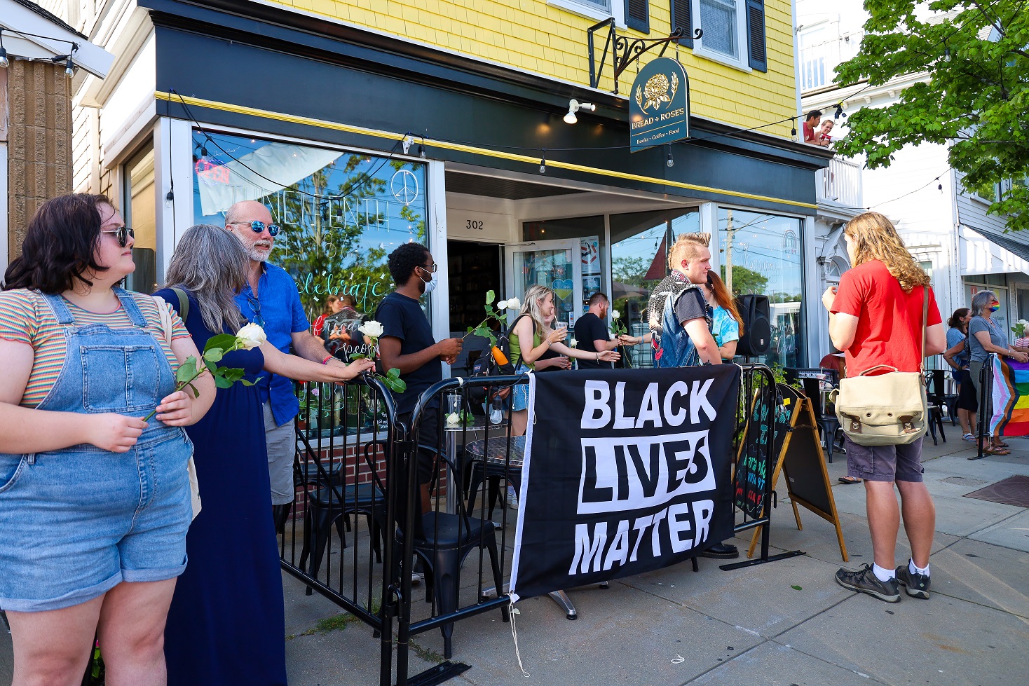 HYANNIS – [HN NOTES] – I was tipped off about a lively protest on Main Street Hyannis, earlier this afternoon. I was told an organization called “Back the Blue” was going to be protesting Bread & Roses, a Hyannis “café, bookshop, and bar.” The beef seemed to be over an anti-police sign hanging inside of the establishment, along with some anti-cop stickers. Unbeknownst to HN, there has apparently been a debate online about the sign and stickers. In response to “Back the Blue” showing up, supporters of Bread & Roses organized a counter-protest of their own.