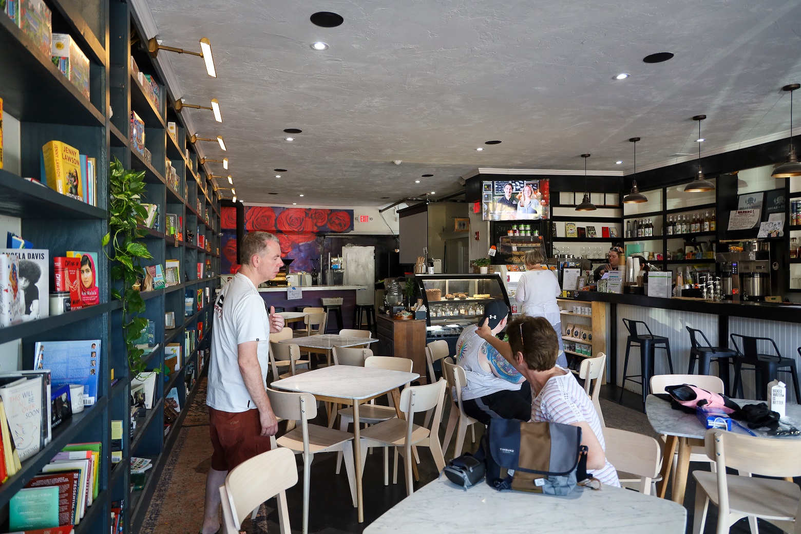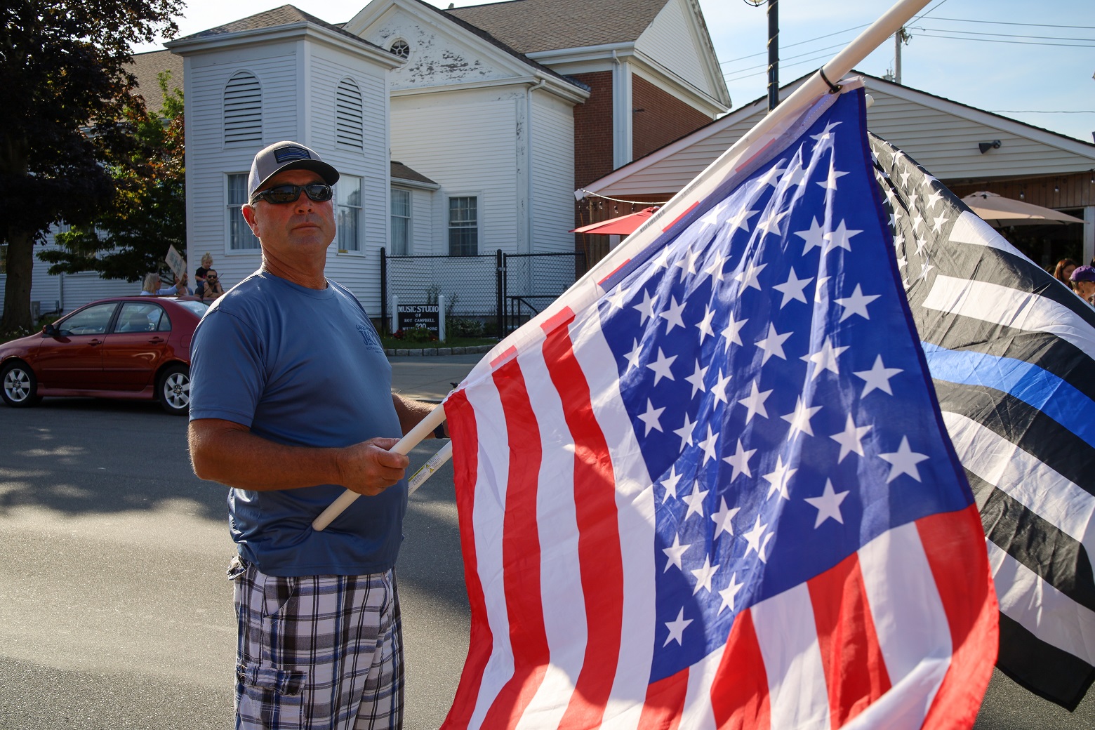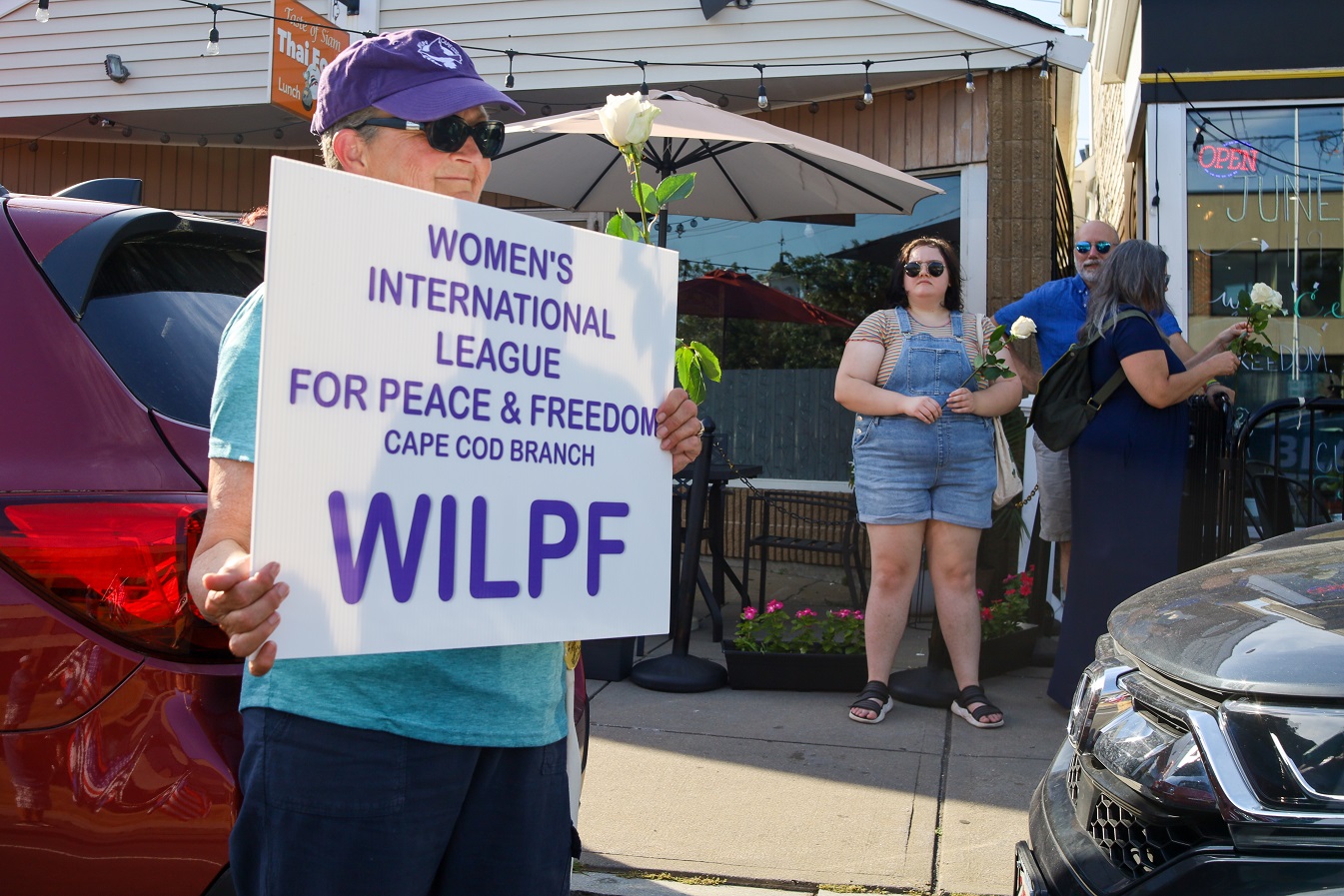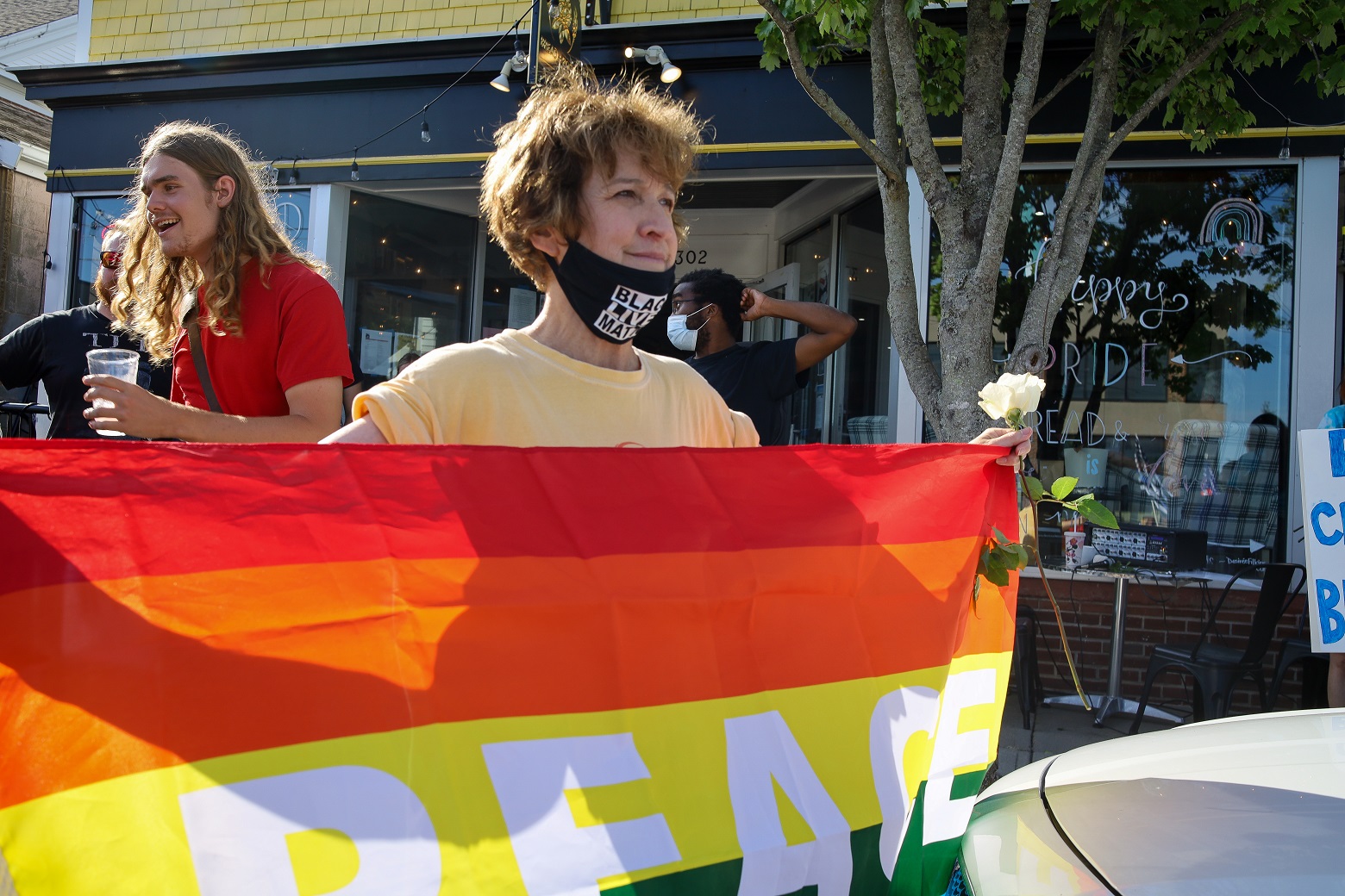 HYANNIS – [HN NOTES] – I was tipped off about a lively protest on Main Street Hyannis, earlier this afternoon. I was told an organization called “Back the Blue” was going to be protesting Bread & Roses, a Hyannis “café, bookshop, and bar.” The beef seemed to be over an anti-police sign hanging inside of the establishment, along with some anti-cop stickers. Unbeknownst to HN, there has apparently been a debate online about the sign and stickers. In response to “Back the Blue” showing up, supporters of Bread & Roses organized a counter-protest of their own.