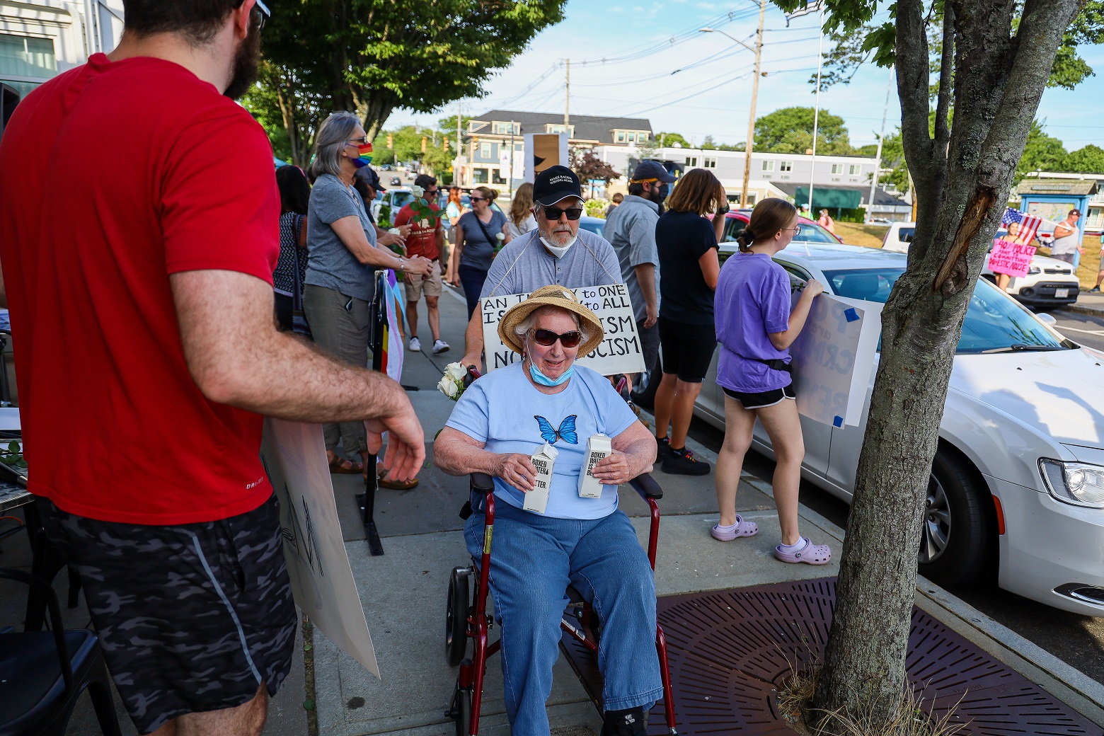 In the first/top HN photo I noticed there was another separate banner promoting a “local love fest.” [It was flying in the middle of the street, directly between both opposing groups.]