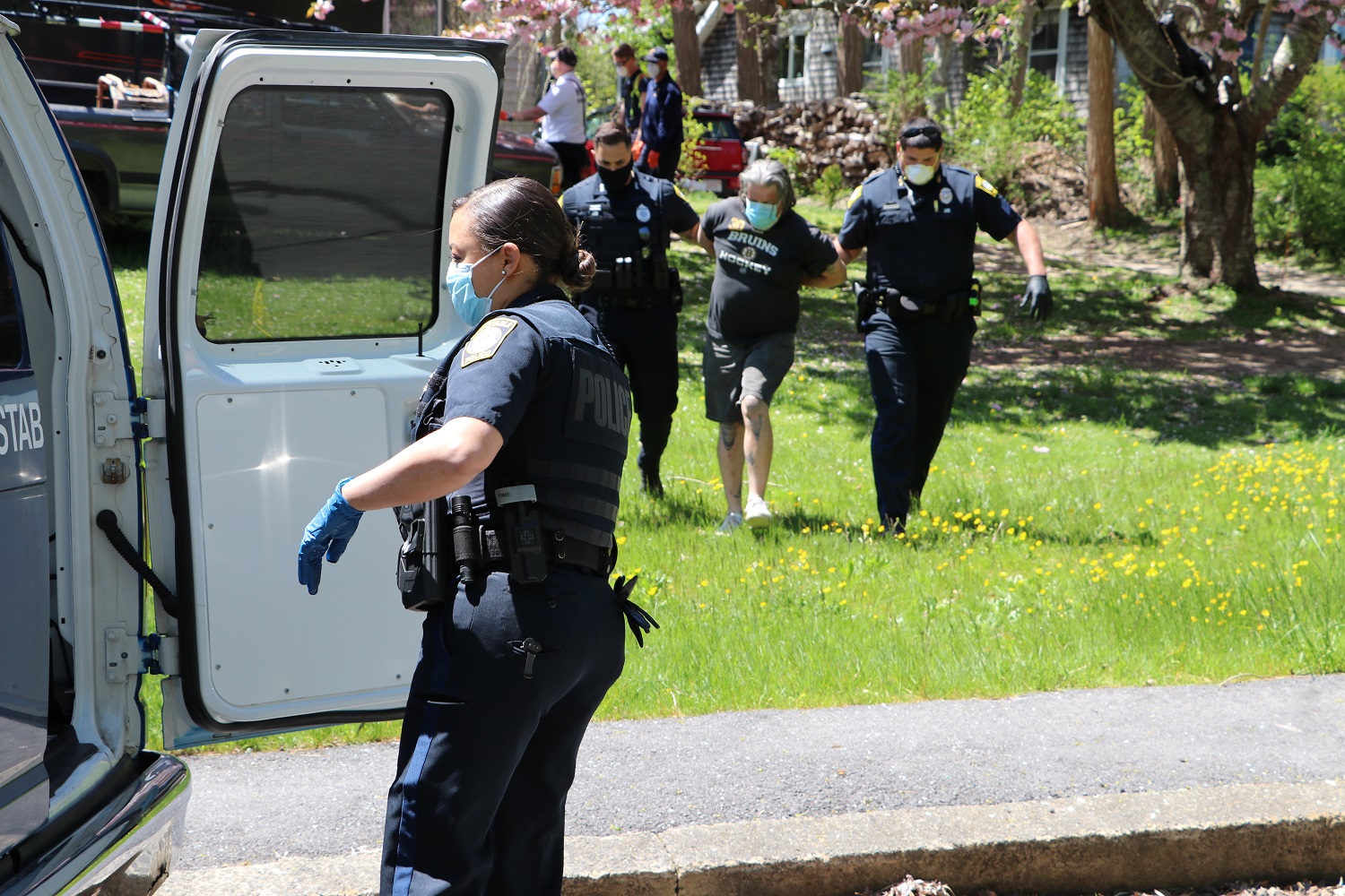 THE FOLLOWING HN PHOTOS: Police responded to a Hyannis address after a woman was allegedly beat up. One male arrested and another male was taken into protective custody.