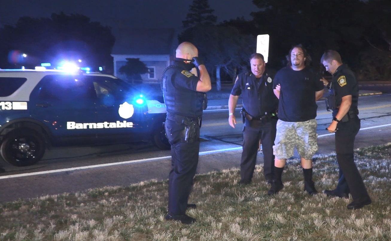 HYANNIS – [DEVELOPING] – The call came in shortly before 9:00 p.m. about a large group in the area of Old Colony Road and South Street in Hyannis (between The Village Green and Ocean Street docks). There reportedly was mention of a gun… and also mention of someone with a pipe. Police and firefighters arrived to find one man down bleeding from a stab wound. HN’s camera was rolling when they took someone believed to be the prime suspect into custody. The victim was transported to Cape Cod Hospital and his condition was unknown at the time of this report… [DEVELOPING]