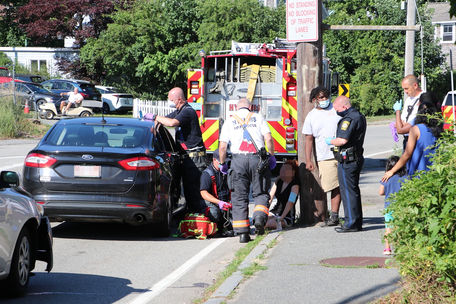 HN NOTES: The following HN PHOTOS show an emotionally charged two-car crash scene that happened earlier this evening on South Street at the intersection of Pleasant Street. When HN arrived on scene, the young mom was sitting on the curb holding her infant, crying, obviously overcome with worry. (Something anyone who has been a new parent can identify with…) The HN PHOTOS also show bystanders who came to help the young mom and her child. They were complete strangers and the mom, nervous and full of anxiety, eventually allowed a female Good Samaritan to help and hold her baby while EMTs attended to her… According to Captain Gregory Dardia of the Hyannis Fire Department, the mom was eventually transported to nearby CCH for evaluation of injuries not believed to be life-threatening… and the baby was reportedly unharmed thanks to being in a car seat during the crash. (click images to enlarge)