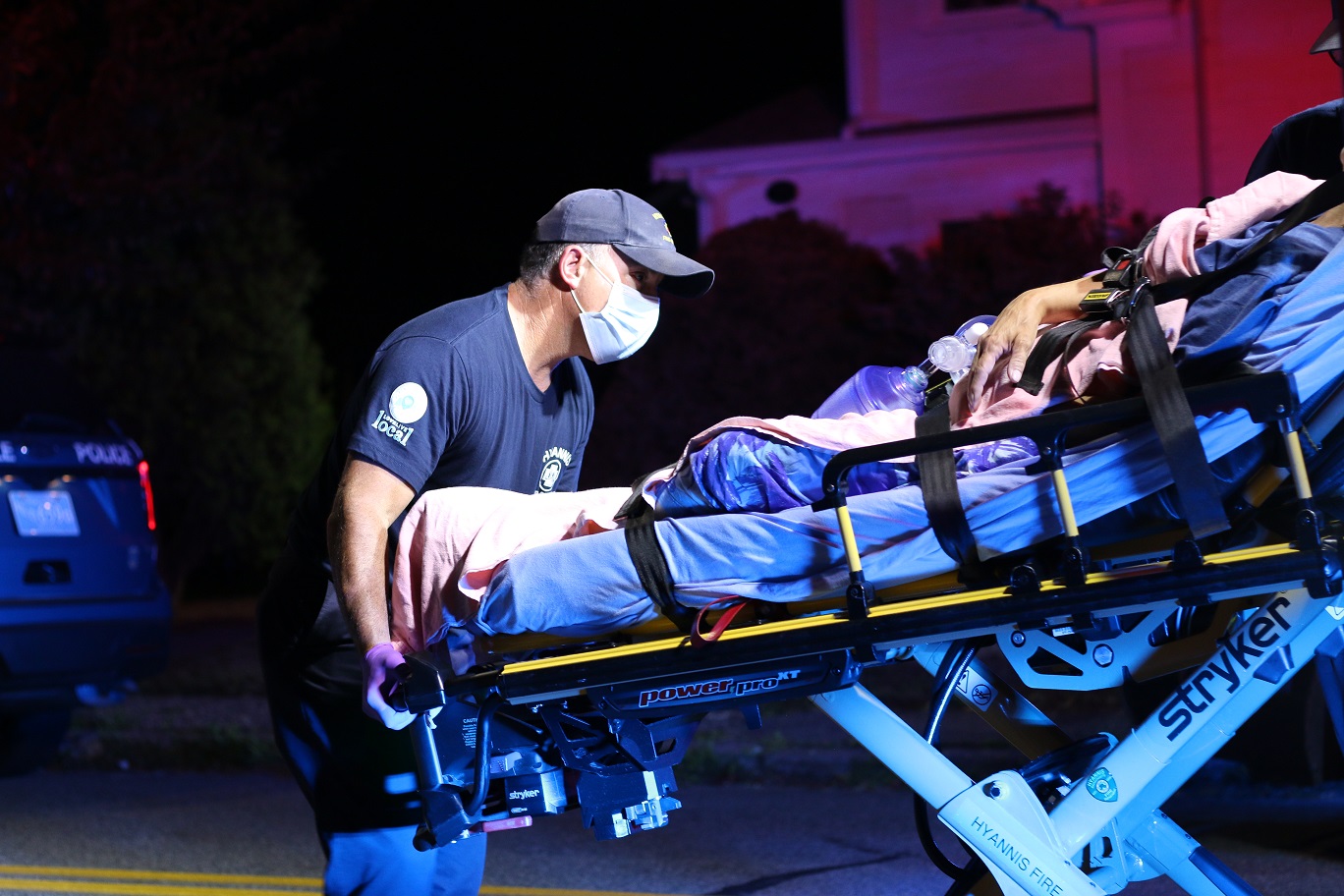 HN PHOTOS – HYANNIS – “A day in the life…” Police and firefighters responded to an address at about 2:30 a.m., this morning, for a report of an unconscious woman found on the ground outside of a residence. The photos show EMTs working quickly to load the apparently still unconscious female into the back of one of their ambulances. No further details available at the time of this report, just photos of the rescue effort…