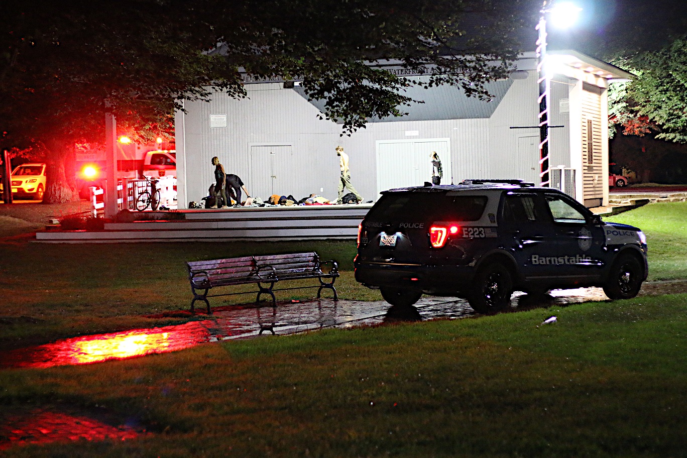 HN NOTES: According to a weather app, it was still 81°F around 1:30 a.m. this morning, when several homeless individuals called EMS, concerned about an unresponsive male who had been sleeping next to them on the Hyannis Village Green bandstand. Police and EMTs were able to eventually awaken the young man, assisting him to his feet and then onto a stretcher. He was nauseous, fatigued, and obviously unsteady… and it’s a good thing someone called. It’s uncertain if the heat was the main cause of his illness, but it certainly didn’t help things. The infirm man was ultimately transported to the emergency room for further care.