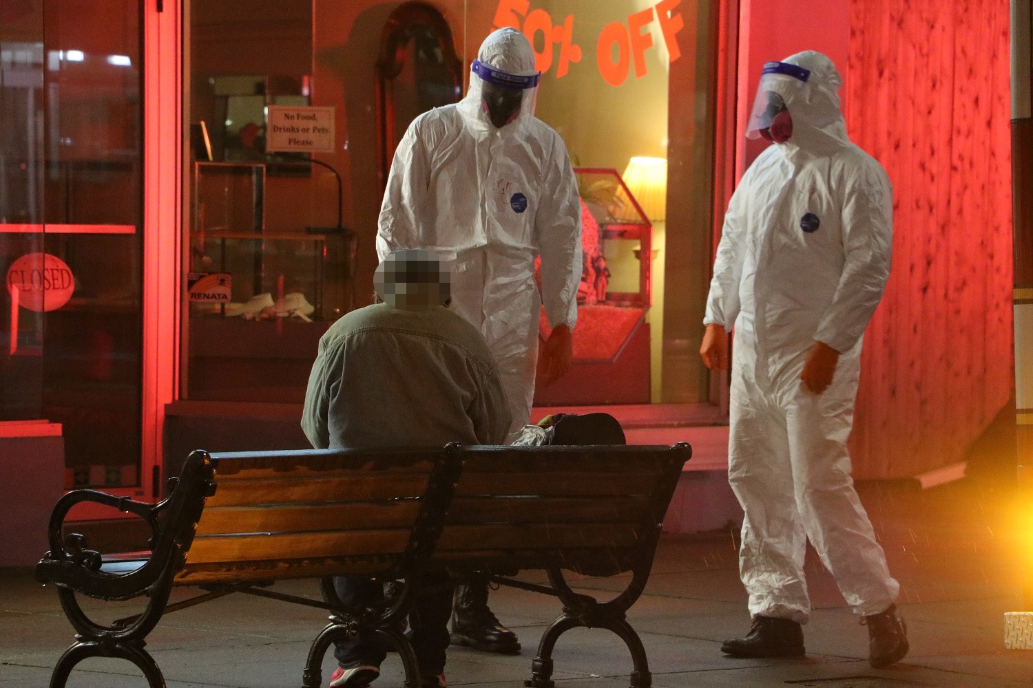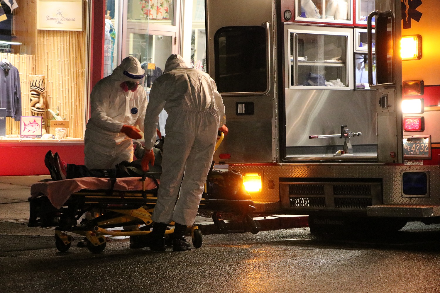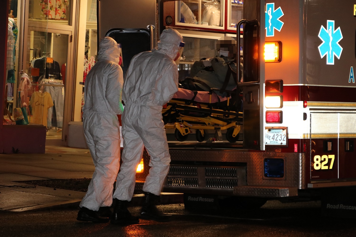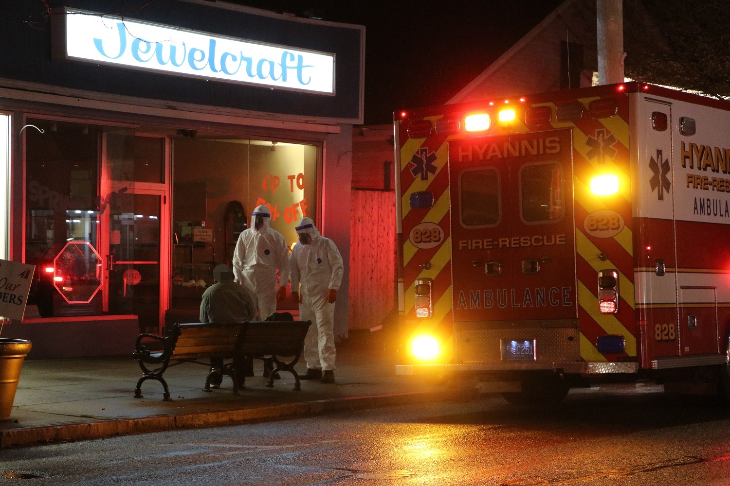 HN Photos: Hyannis EMTs call for a COVID-19 “isolation ambulance” for a patient they encountered sitting on a Main Street bench in downtown Hyannis shortly after 11:00 p.m. last evening…