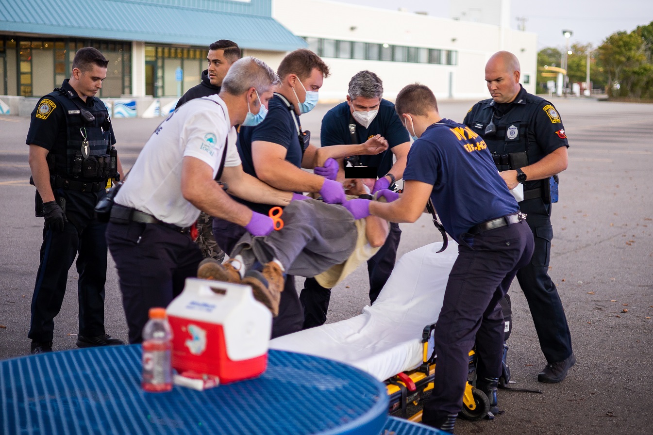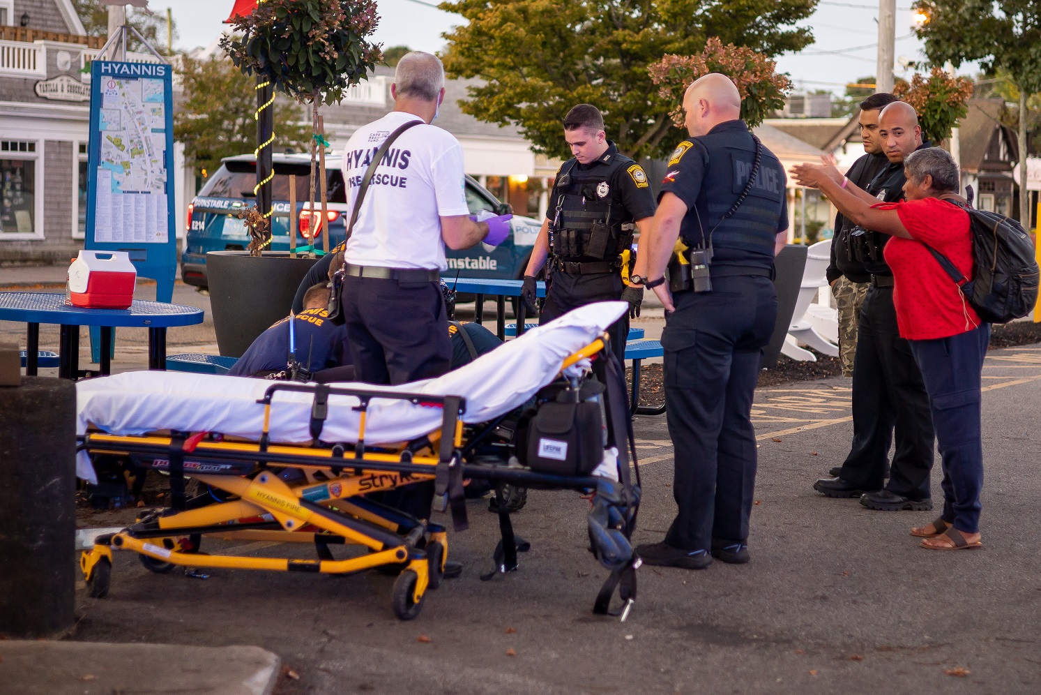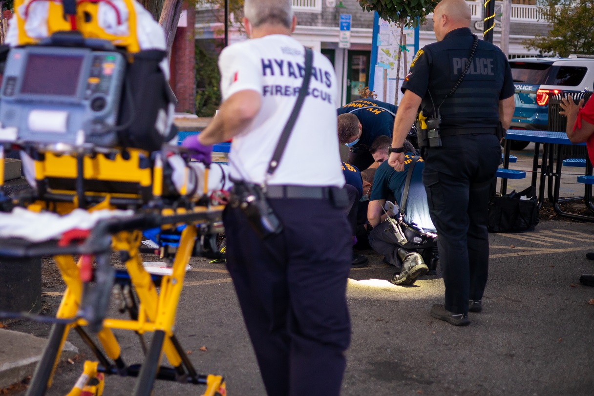 HYANNIS – The call initially came in as man who had been badly hurt during some type of attack on Main Street. It was later learned the man fell and suffered a head injury with heavy bleeding – there was no attack. A Barnstable Police Patrolman wasted no time nonetheless, applying pressure to slow the bleeding. Hyannis EMTs arrived and took it from there. The patient, now in good hands, and thanks to police, was transported to CCH for further care.