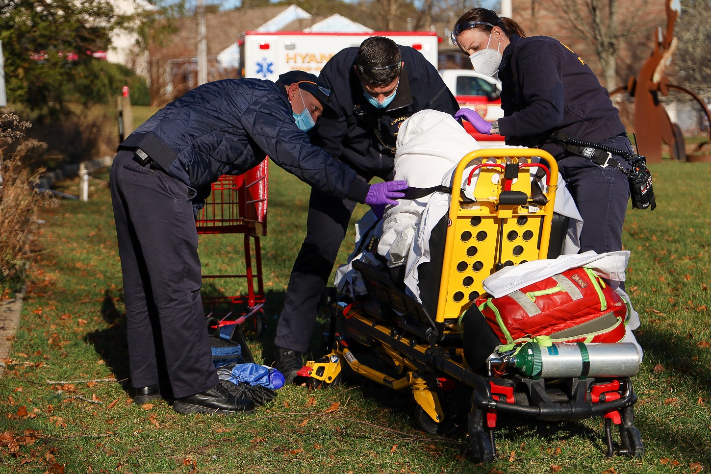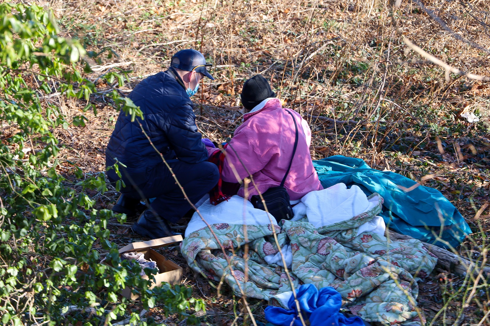 ABOVE HN PHOTOS: Hyannis Firefighters help a homeless woman found suffering in the bitter cold this morning. She had been “camping” in the woodline along Main Street, in the West End – Hyannis, Massachusetts – January 4th, 2022