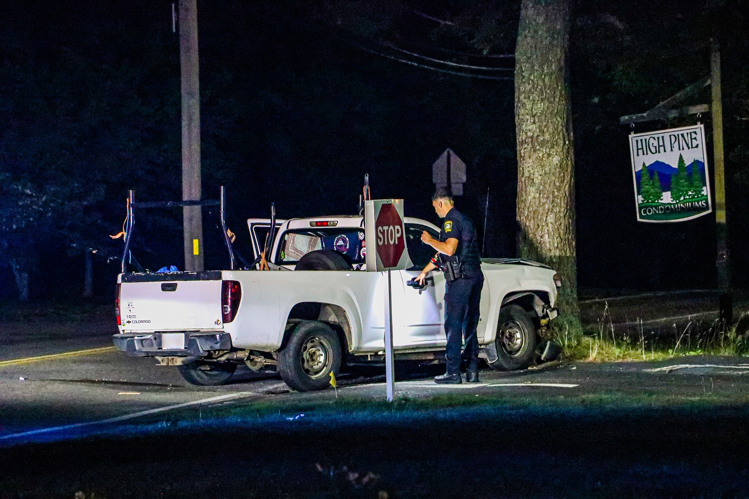 The pickup was registered to a nearby address in Hyannis and a concerned family member immediately responded to the scene, obviously very worried about the driver. The family member was assured the driver was okay as she recovered a work belt and some tools from inside of the truck.