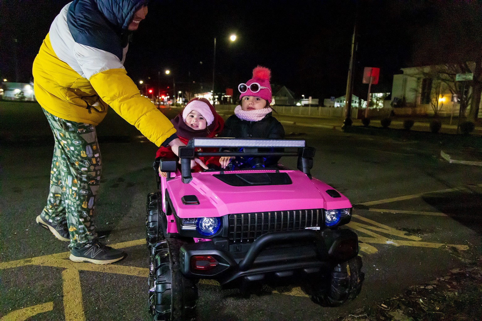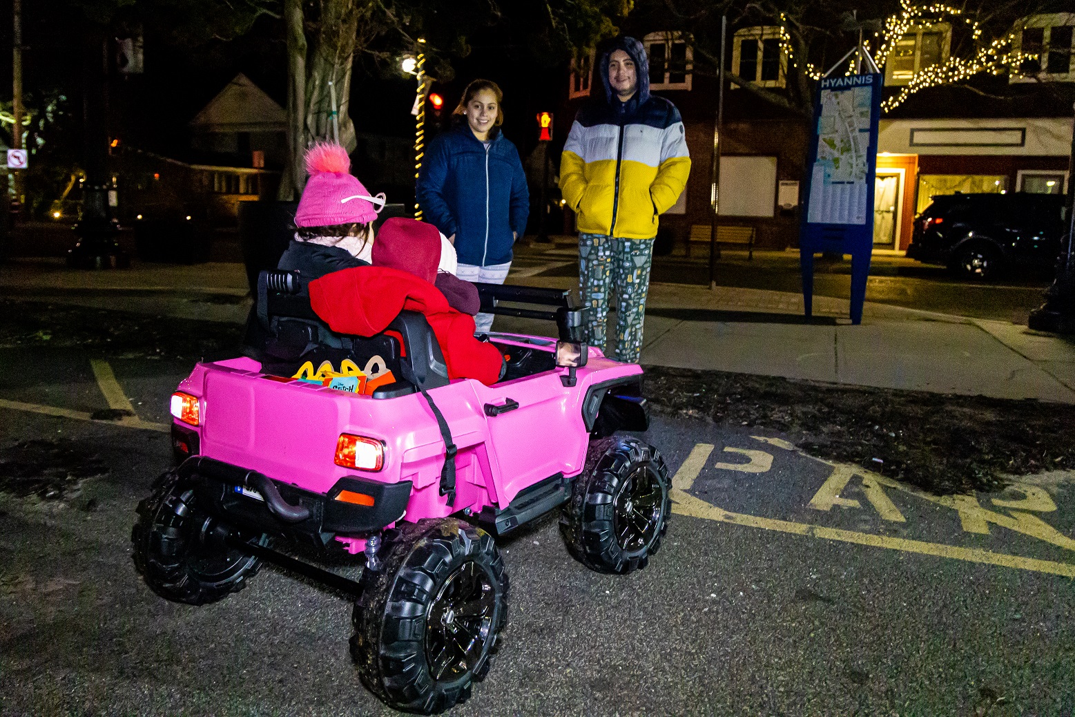 HYANNIS – [HN NOTES] – Tatiana (4 years, 6 months old) and Ashley (1 year, 4 months old) felt the MacDonald’s Happy Meals calling them from across the parking lot early last evening. The two sisters were on mission for burgers, fries, and a small plastic toy. It was serious. Speed and rugged tires mattered. Their pink plastic Jeep, up-fitted with an off-road light bar, black grill guard and skid plate (just in case), was the logical choice.