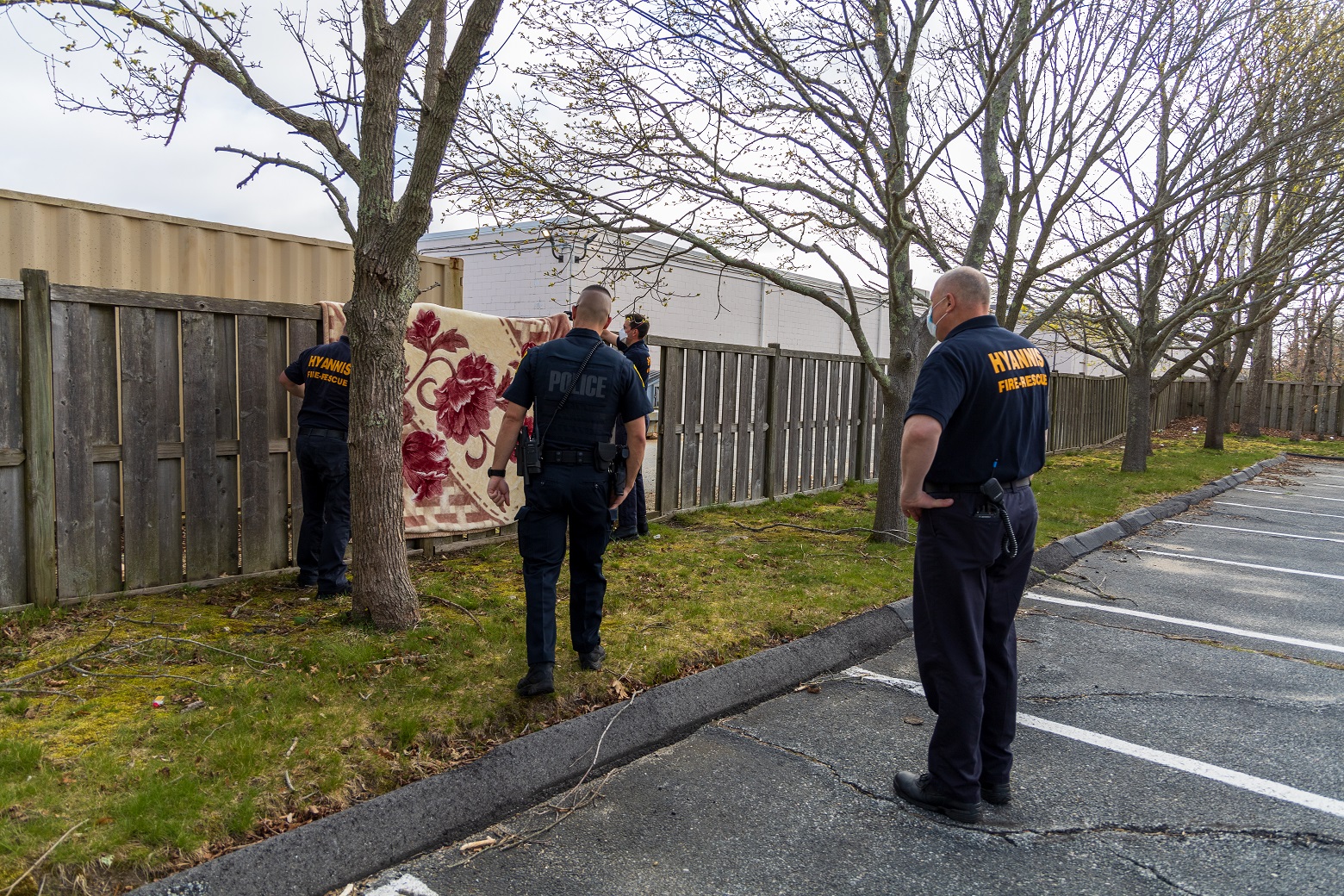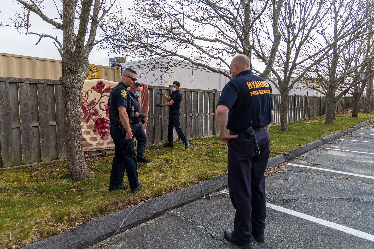 HYANNIS – Police and firefighters rushed to an empty parking lot on Barnstable Road yesterday morning after a couple of office employees arrived at work and observed what appeared to be a body underneath a bloody blanket. (From a distance it actually looked like the real deal…) But upon closer inspection… and to the relief of everyone, including the two employees, the bloody blanket turned out to be a discarded rolled up carpet with a fresh blood-toned floral design. (No body.)