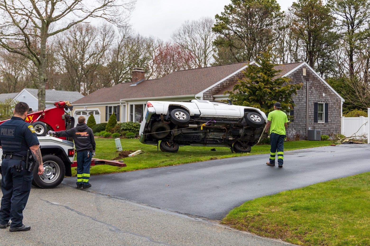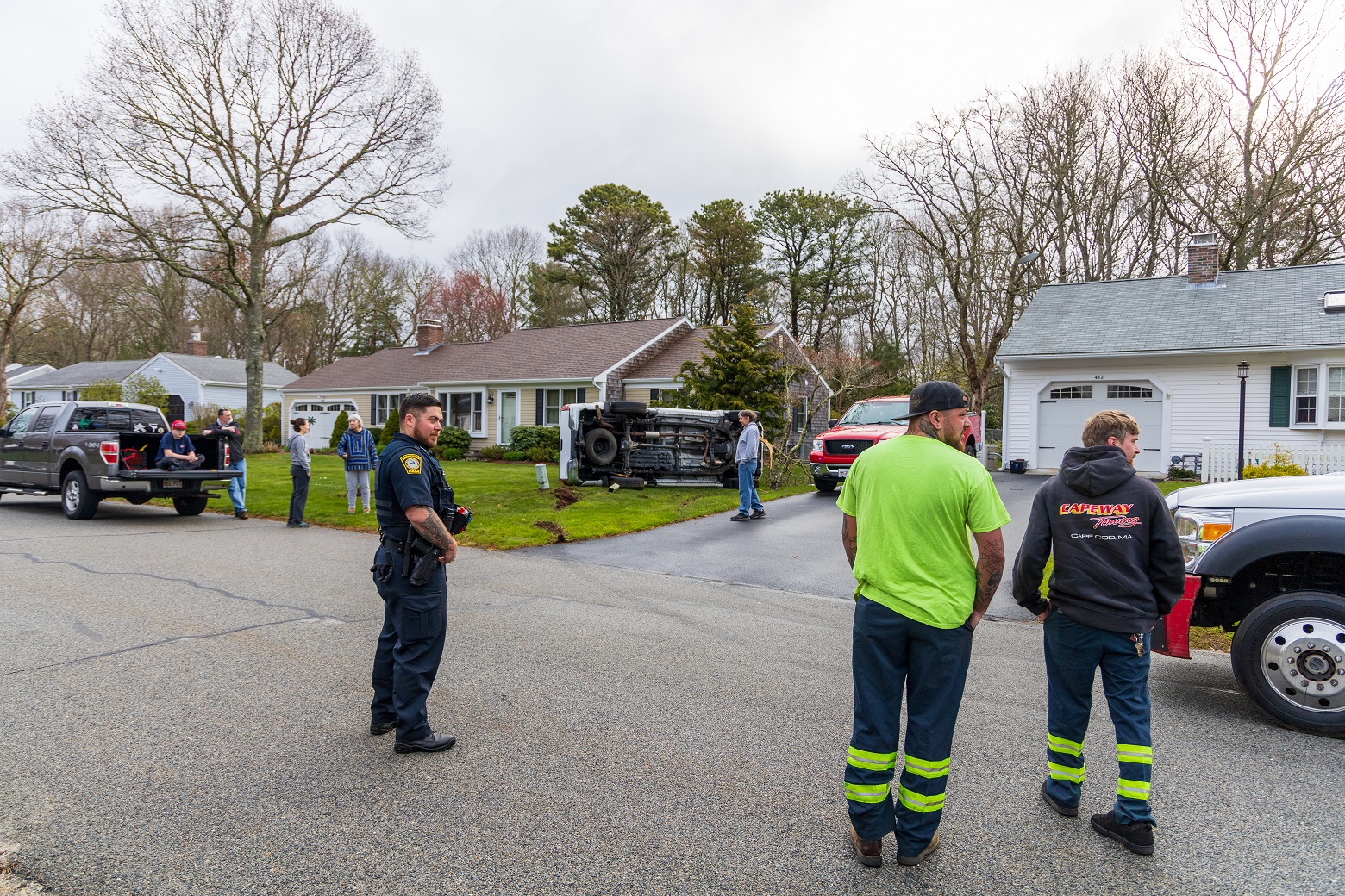 CENTERVILLE – A high school student escaped injury after the pickup he was driving rolled onto its side while commuting to classes this morning. The crash happened on Prince Hinckley Road. The Barnstable Police Department is investigating the cause of the crash. (Excessive speed while hugging the neighborhood turns has not been ruled out as a factor…)