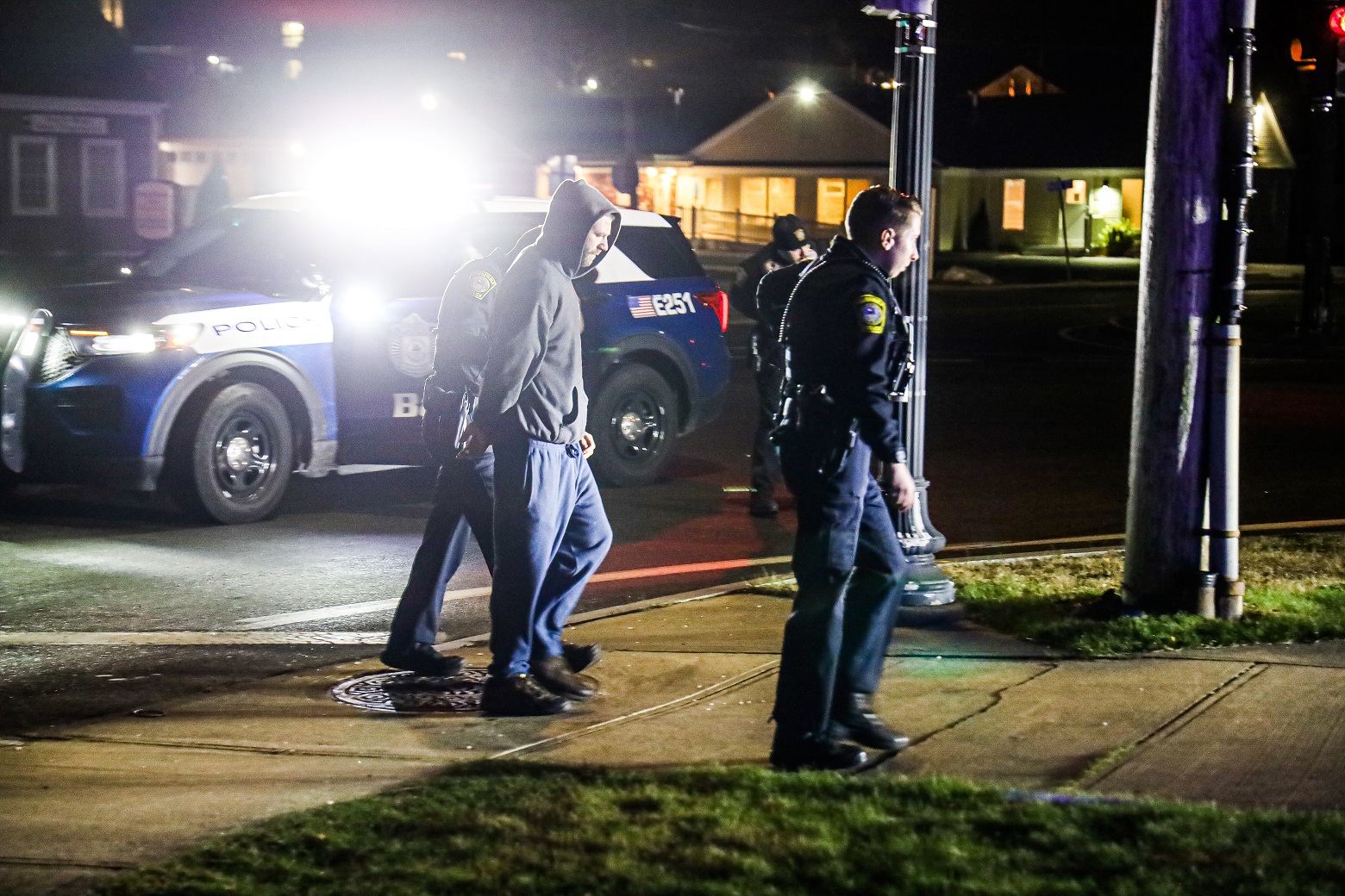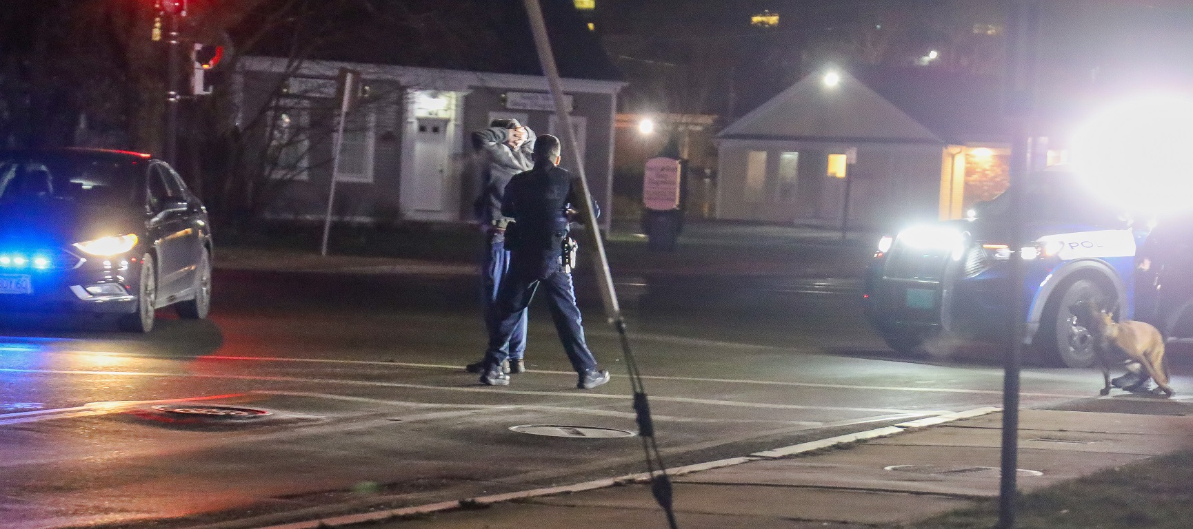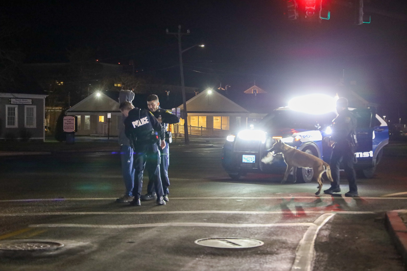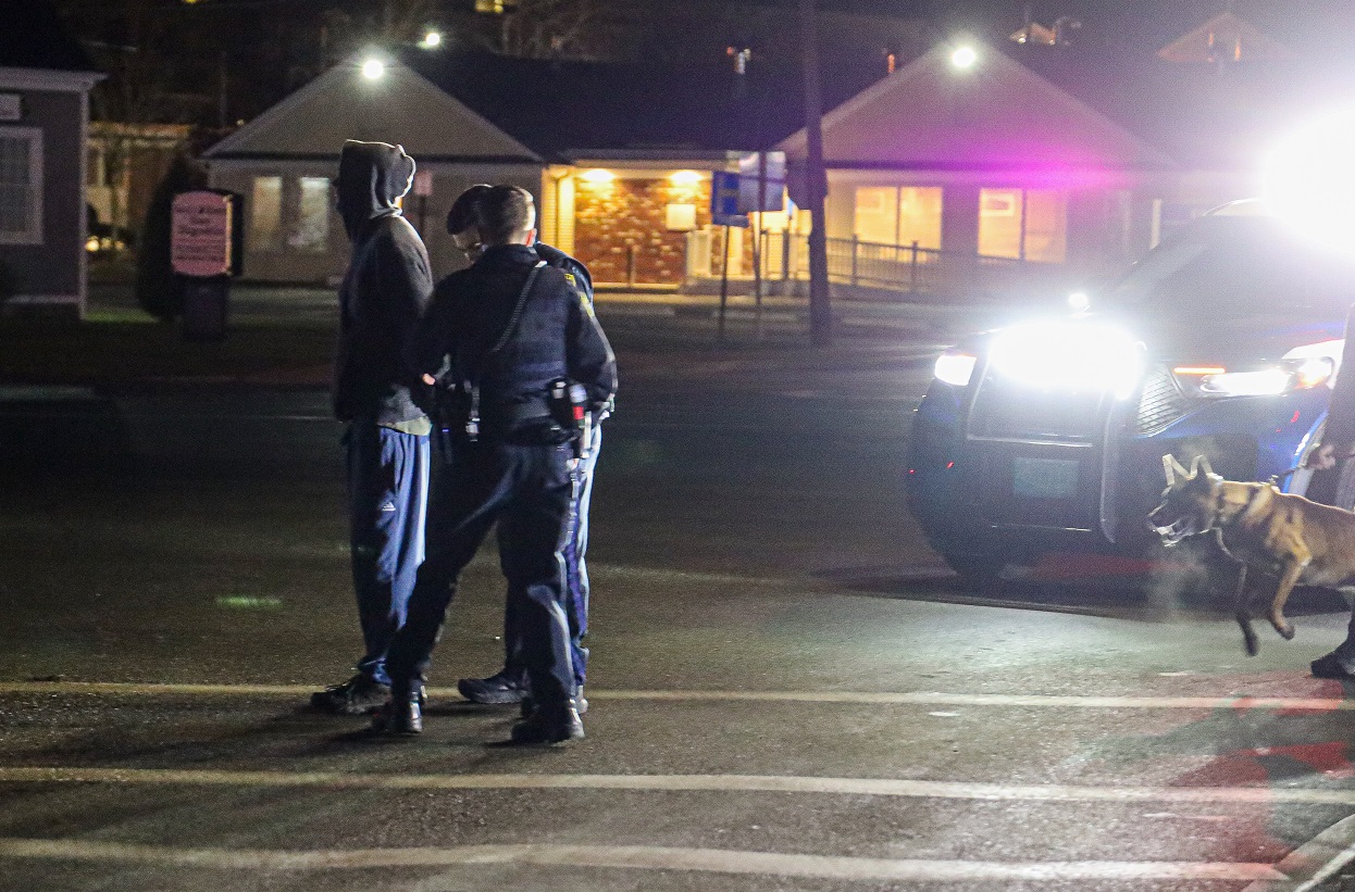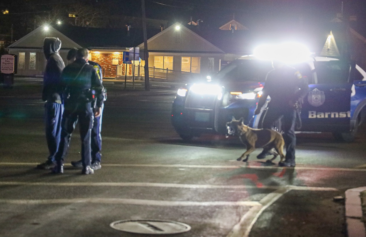 HYANNIS – Barnstable Police Officers arrested a wanted man in the middle of the Main and Camp Street intersection early this morning. The 38-year-old reportedly had three warrants for his arrest, including one for Assault & Battery on a Police Officer. Several officers arrived on scene, including Patrolman Nolan O’Melia and K-9 partner Alex. Officers were able to effect the arrest without incident…