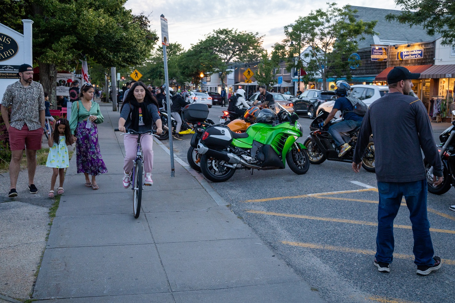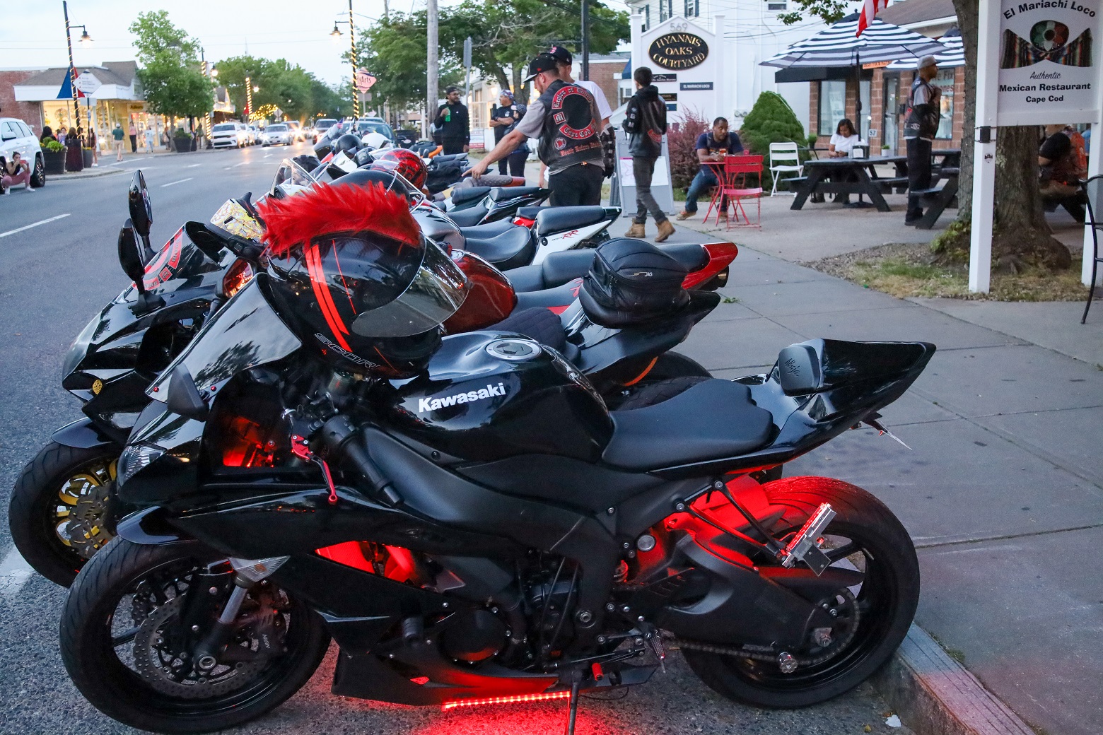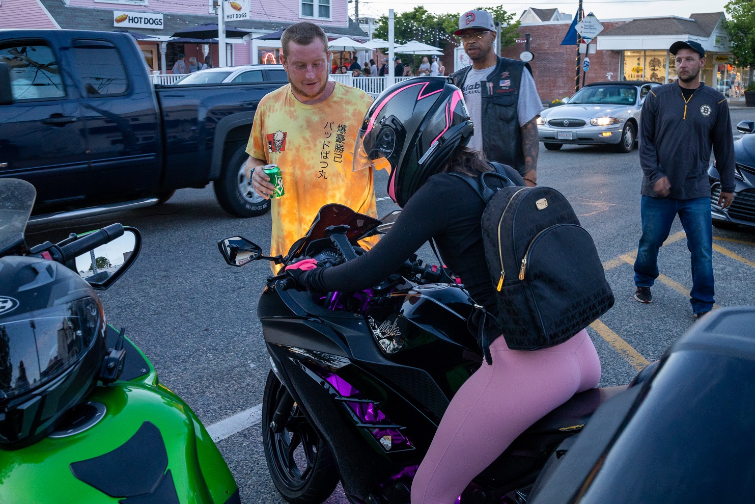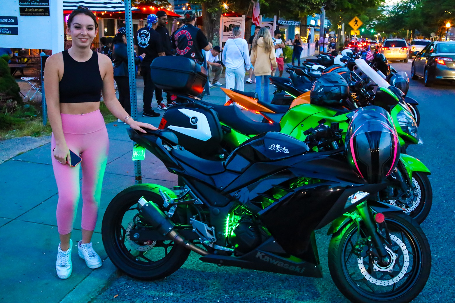 HN spoke with Alexa (top HN Photo) who was out having a ball on her Kawasaki Ninja after a long day at work. Alexa, age 22, and a self-professed “tomboy,” says she grew up riding 4 wheelers. She started riding her first street bike about a year ago. Safety skills and awareness are essential for all motorcyclists and Alexa plans on soon completing a biker safety course. (One can never be too careful these days…) Last evening, she was out riding with a club of mostly men who visit Main Street every Wednesday evening for snacks and a little bit of hemming and hawing about this, that, and the other thing…