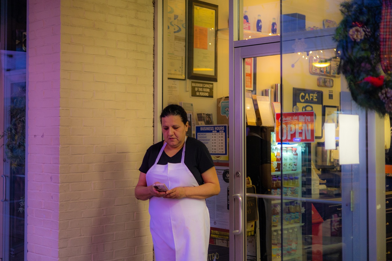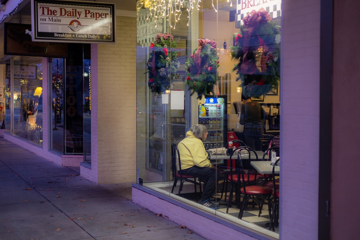 No longer interested in the actual sky, I spun around and noticed this wonderful woman in a yellow hoodie, seated inside The Daily Paper with her breakfast. The sunrise giving the bricks a special hue. The Christmas wreaths, red and green with frosted pine cones. I had to have it – *snap!* Got it!