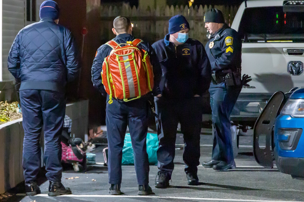 HYANNIS – A woman was sitting on a cement retaining wall with her bags packed as HN arrived on scene. She was very upset, alleging she had just been sexually assaulted. A little dog was standing next to her and her bags, barking at officers.