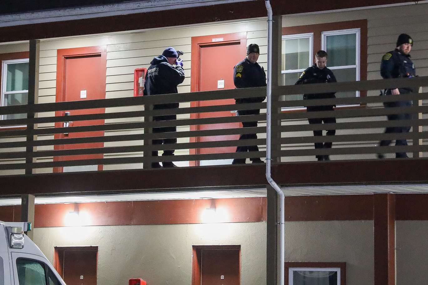 Across the parking lot from the handcuffed man, on the hotel’s second floor, a patrolman stood guard in front of the outside entrance to room number 203. Room 203 was the alleged scene of the crime. The assault allegedly happened on the bed closest to the door, to be more specific.