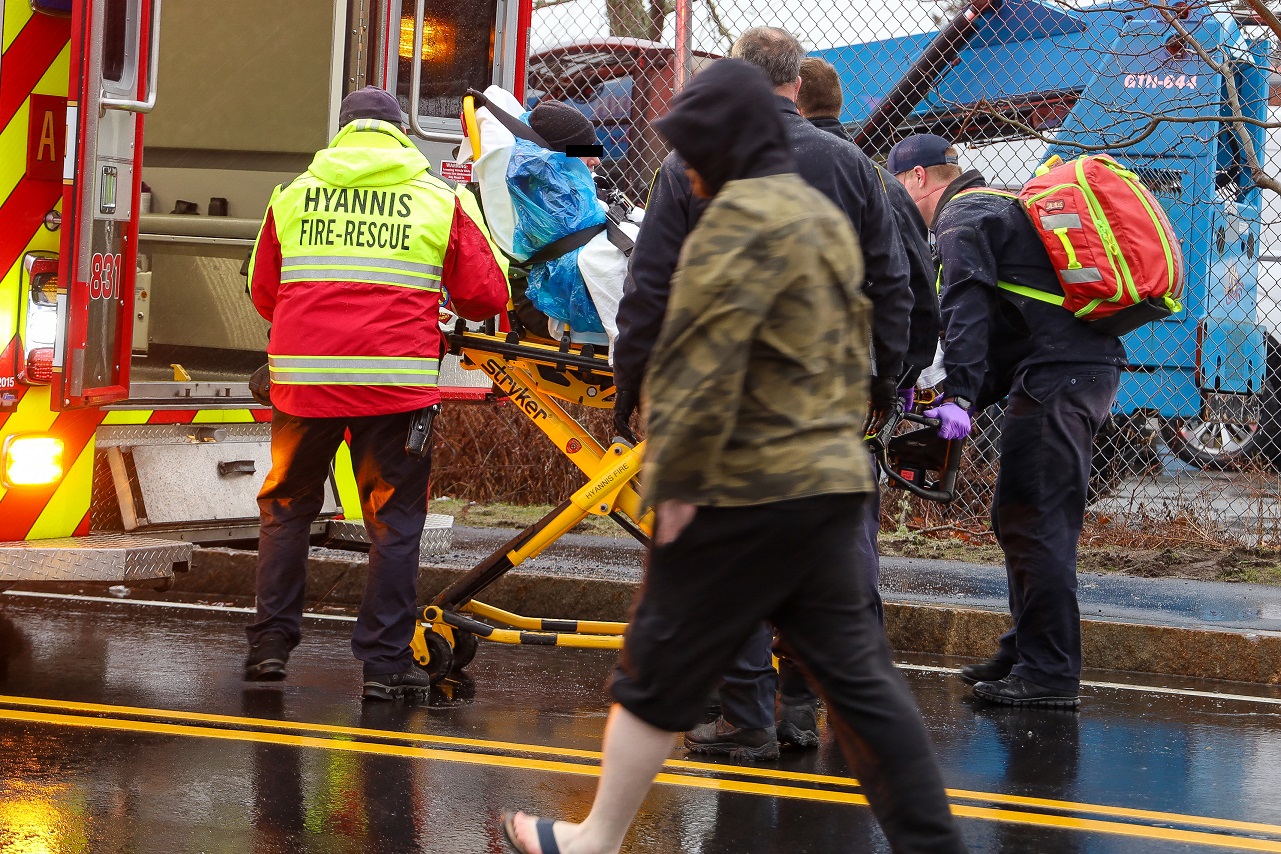 In the above HN Photo, firefighters responded to Winter Street to assist a middle-aged man who was poorly protected from the elements, sitting alone on the wet ground during a blustery, steady rain. He was wearing a cheap blue plastic bag fashioned into a makeshift rain poncho. And he was soaking wet.