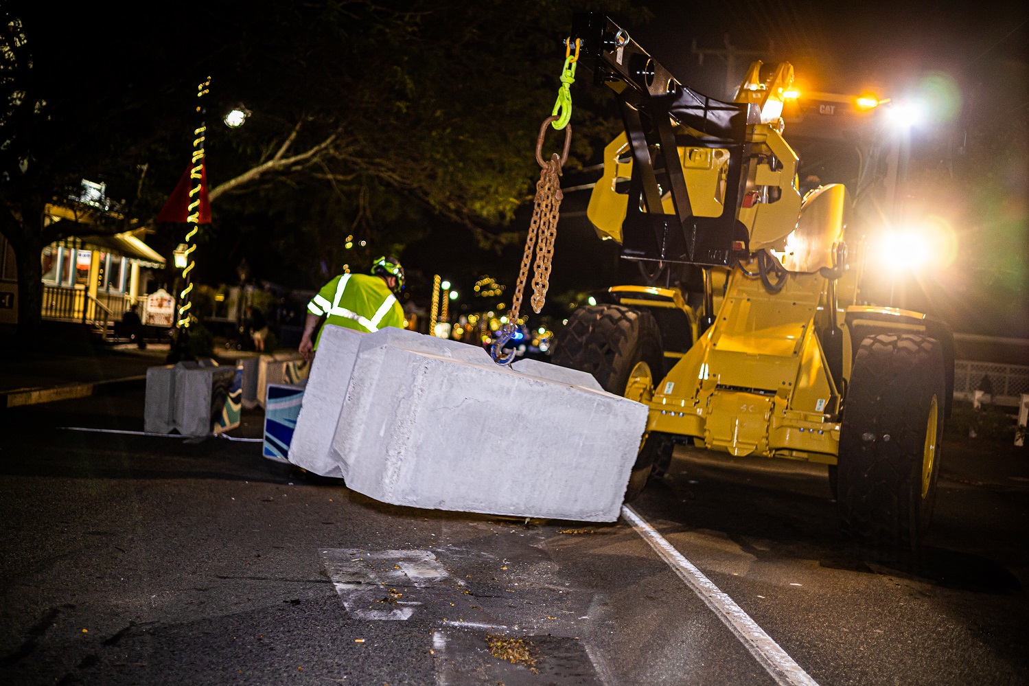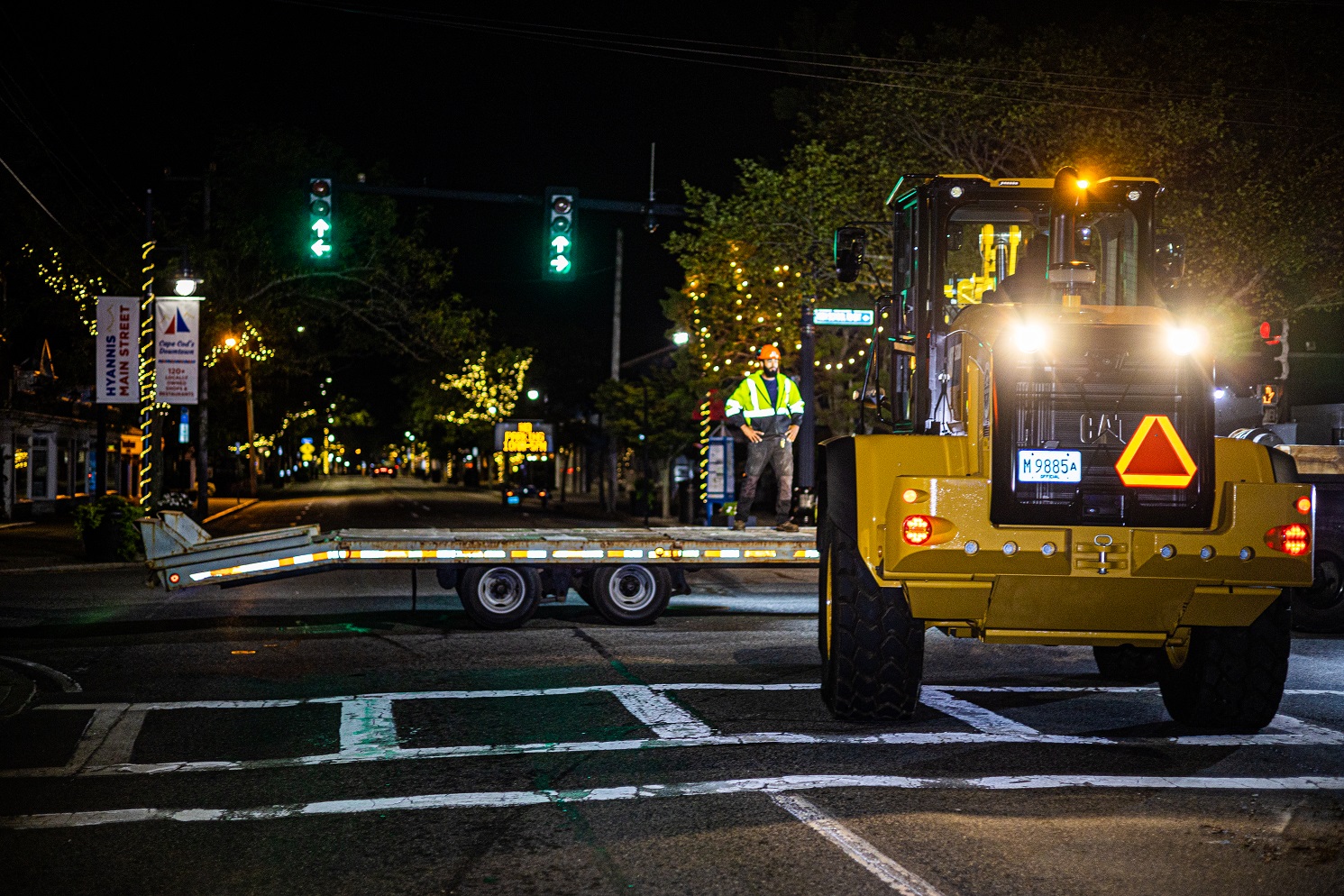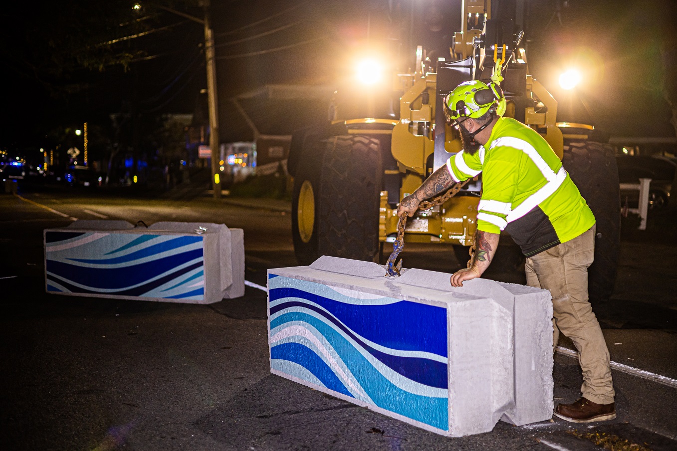 HYANNIS – [HN PHOTOS, NOTES & MULLINGS ON THE MATTER] – Shortly after midnight and throughout the early morning hours of June 16, 2020, per order of the Barnstable Town Manager, the DPW began placing cement blocks down the center of Main Street, Hyannis.