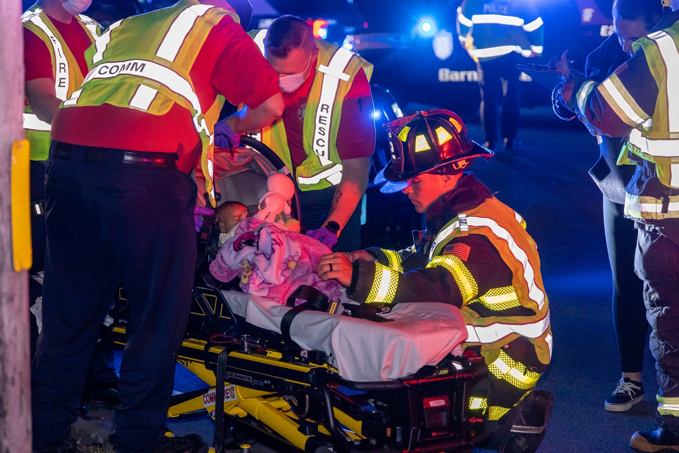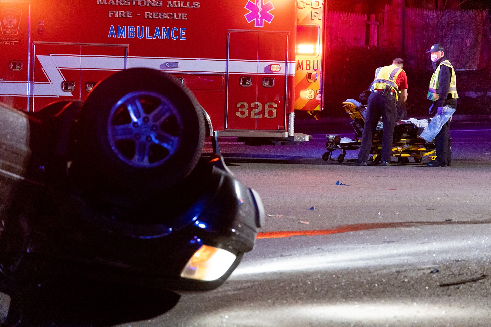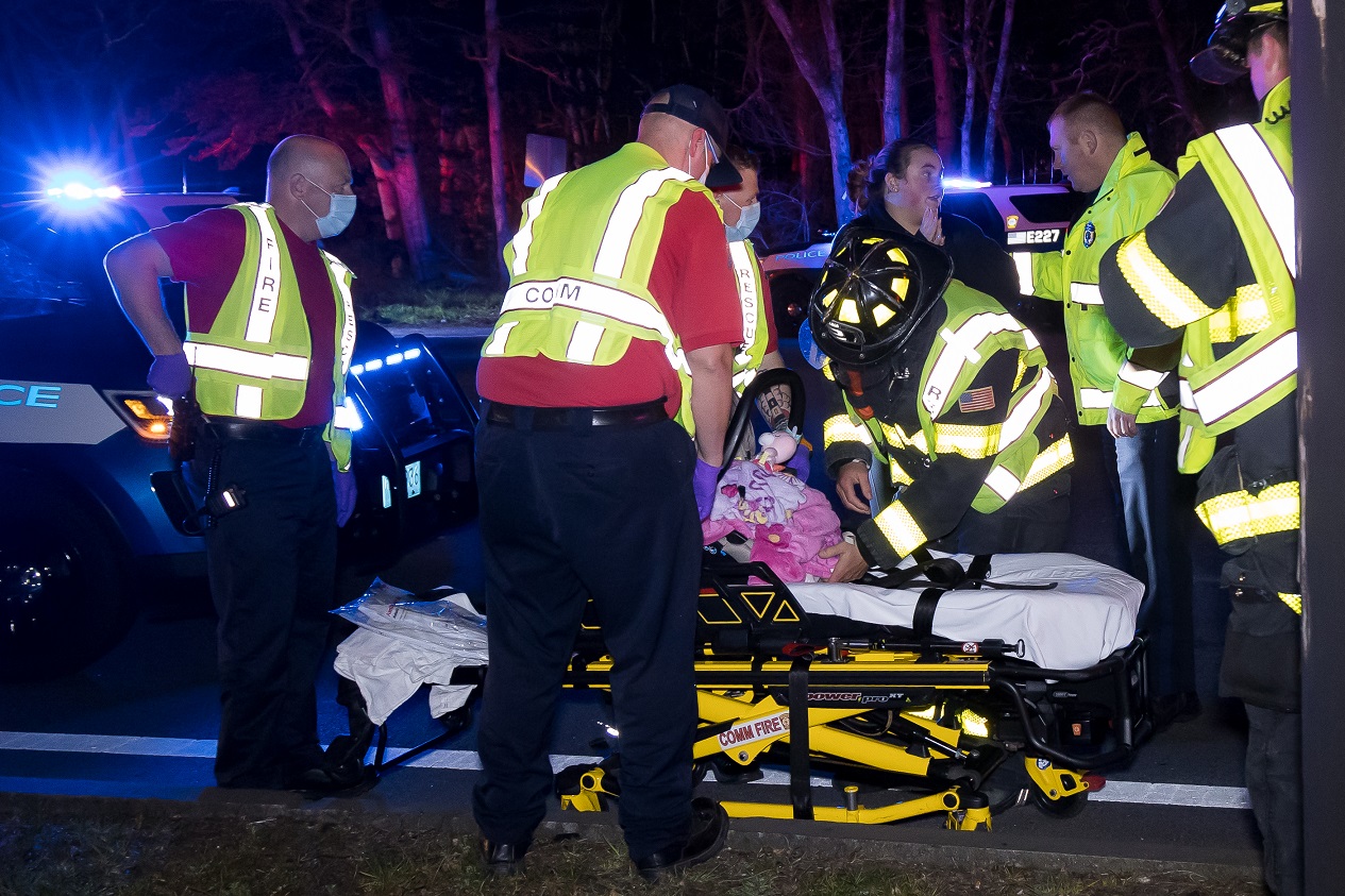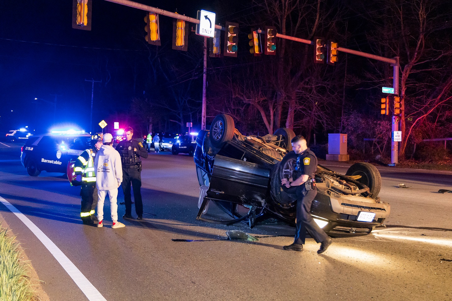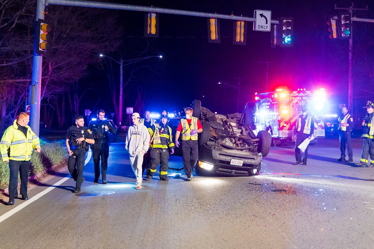 CENTERVILLE – At around 2:30 a.m. this morning, Barnstable Police and C.O.M.M. Firefighters responded to the intersection of Route 28 and Phinney’s Lane for a two vehicle crash where one of the vehicles landed on its roof. The crash involved a pickup truck and a Honda CRV. The CRV rolled onto its roof and would need to be towed. The pickup truck had damage to its left rear side, but otherwise appeared drive-able. An infant had been in a car seat, in the backseat of the pickup truck. The baby’s mother looked on with apprehension as EMTs secured her newborn onto a stretcher. The baby appeared to be okay but would eventually be transported to Cape Cod Hospital as precaution. In one of the above HN Photos a Barnstable Police Sergeant is seen apparently reassuring the worried mother. The driver of the Honda CRV was able to walk to an awaiting ambulance and was eventually transported to CCH for evaluation.