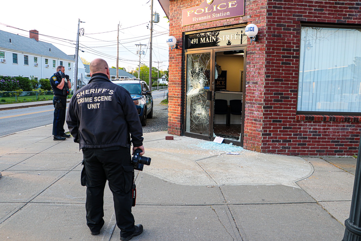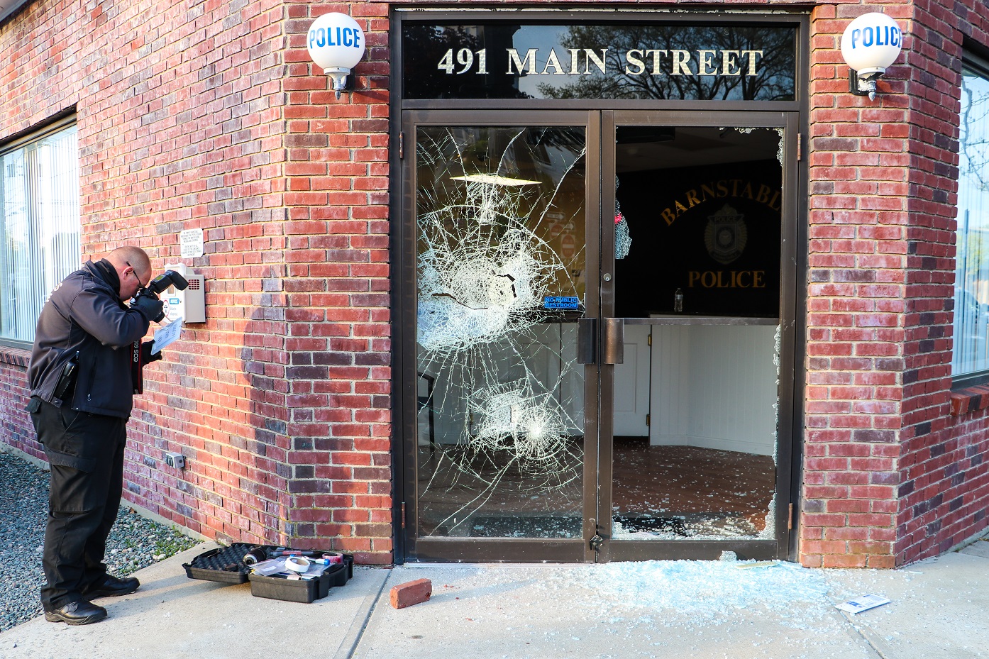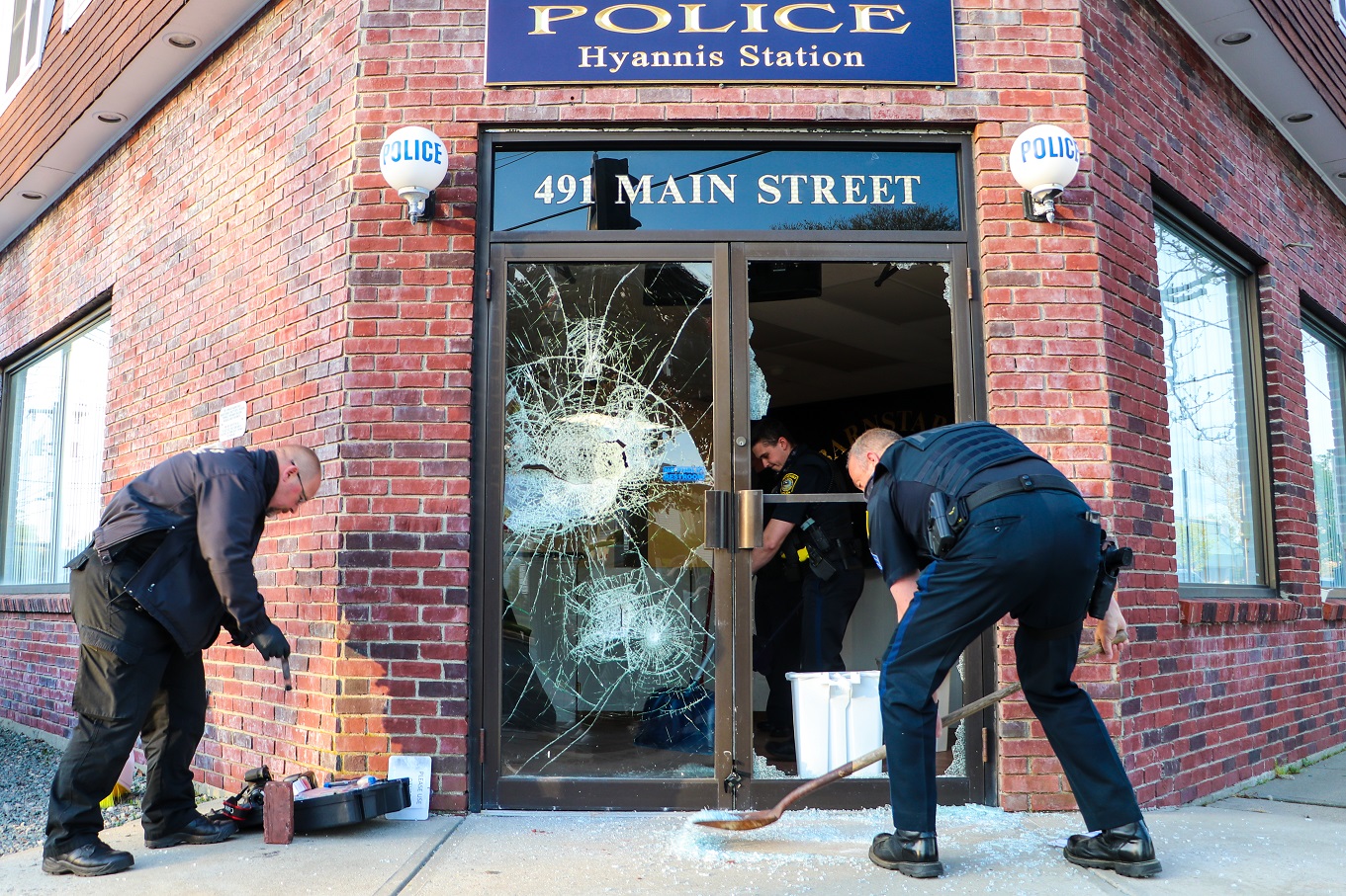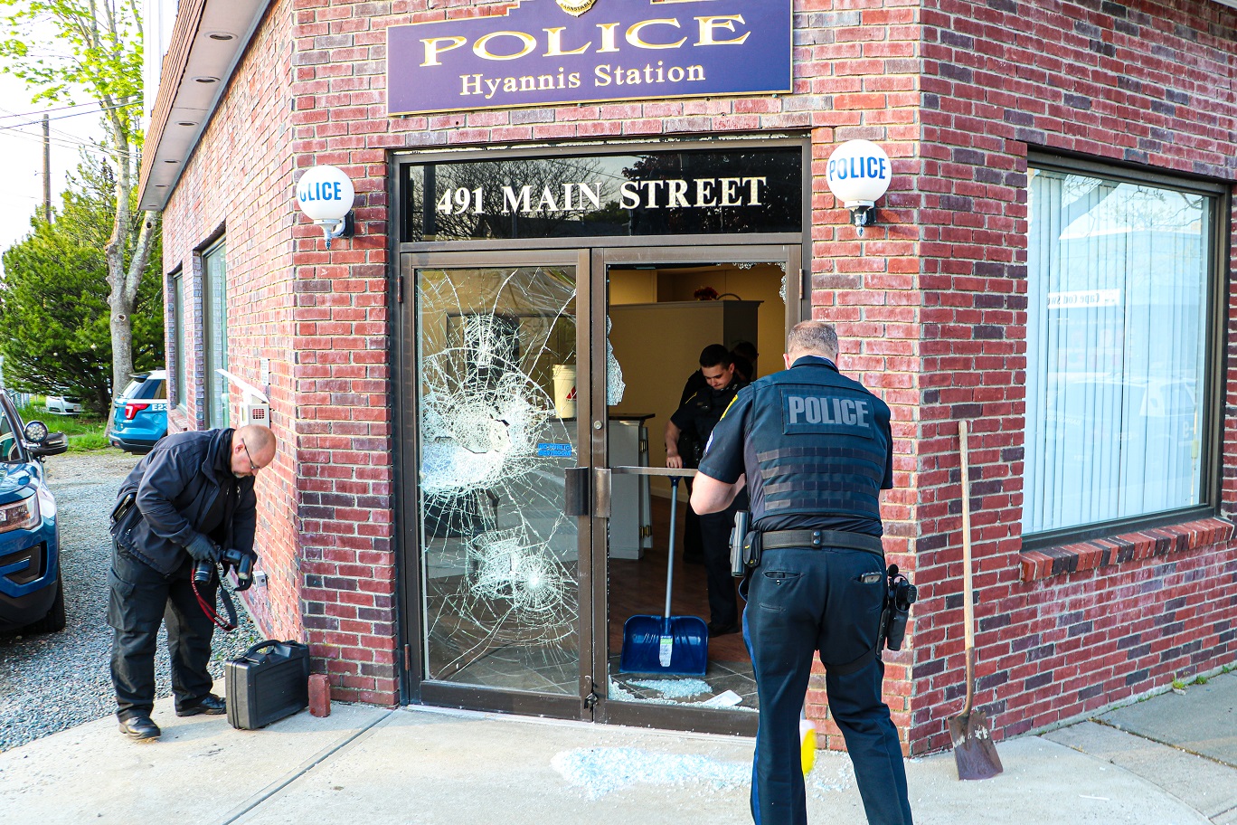 HYANNIS – This was the scene outside of the Barnstable Police substation on Main Street this morning shortly before 7:00 a.m., about an hour before these young patrolmen (including one rookie) were getting off their shift. One officer on scene described last night’s shift as one of their busiest overnights of the season thus far. To end their shift by coming across such hateful, negatively symbolic destruction to their workplace was not a nice feeling. But being professionals, these young police officers grabbed brooms and buckets, and began picking up the pieces. Tonight will likely be another busy night…