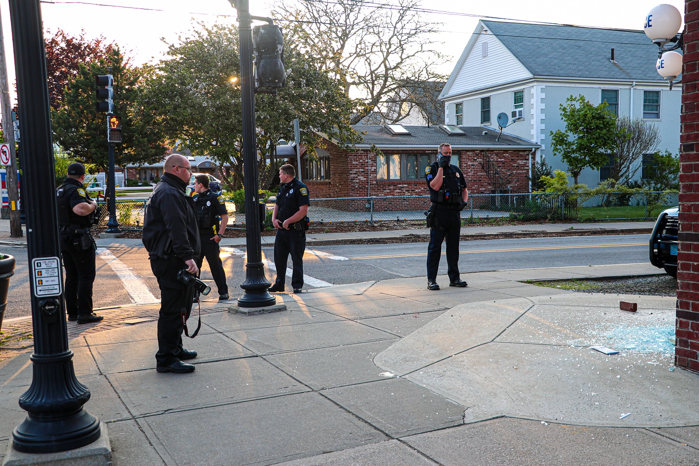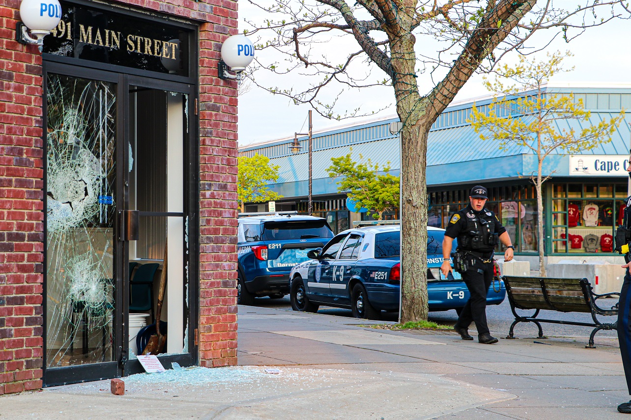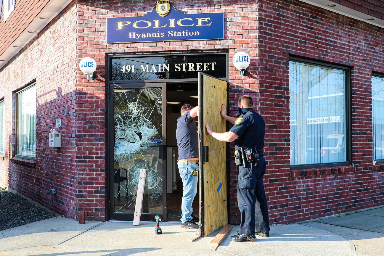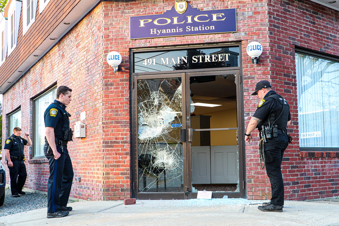 HYANNIS – This was the scene outside of the Barnstable Police substation on Main Street this morning shortly before 7:00 a.m., about an hour before these young patrolmen (including one rookie) were getting off their shift. One officer on scene described last night’s shift as one of their busiest overnights of the season thus far. To end their shift by coming across such hateful, negatively symbolic destruction to their workplace was not a nice feeling. But being professionals, these young police officers grabbed brooms and buckets, and began picking up the pieces. Tonight will likely be another busy night…