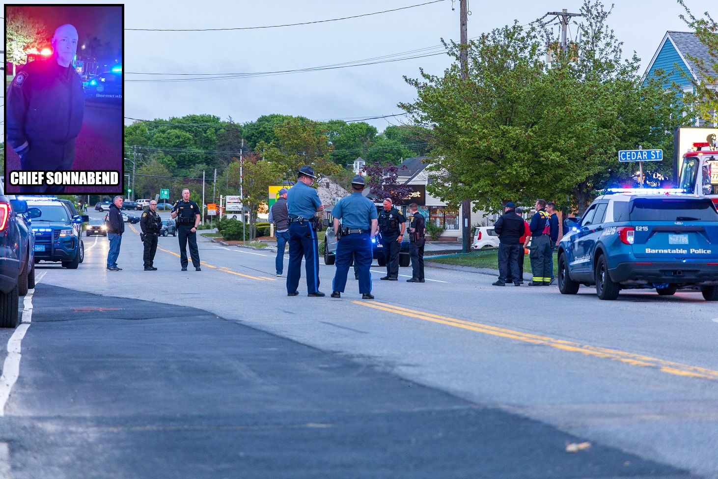 Route 28 was completely closed down as the entire ordeal unfolded over a period of about three hours. The following HN Video contains interviews with Chief Matthew Sonnabend of the Barnstable Police and others… it also contains radio traffic and video from the scene…