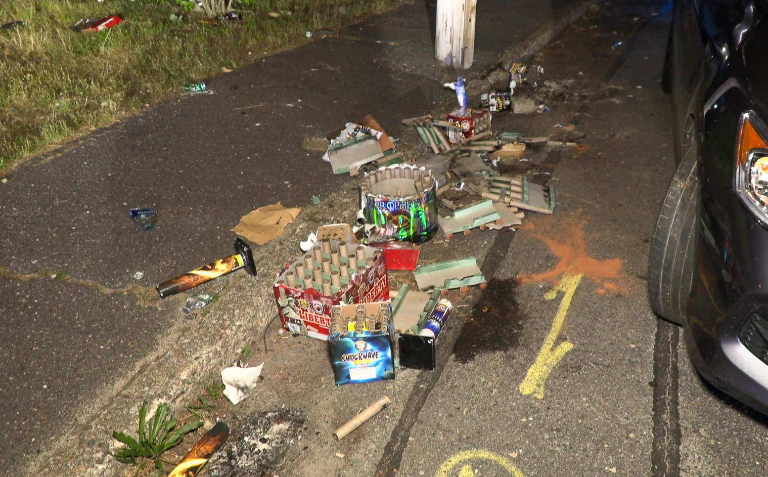 As you will see in the following HN Video, numerous police cruisers turned onto Fresh Holes Road near the intersection with Hiramar Road. It appeared there had been some sort of party on Fresh Holes Road, empty beer and liquor bottles littered the area. As you will see, there were also spent firework launchers cluttering up the area. There was broken fencing too…