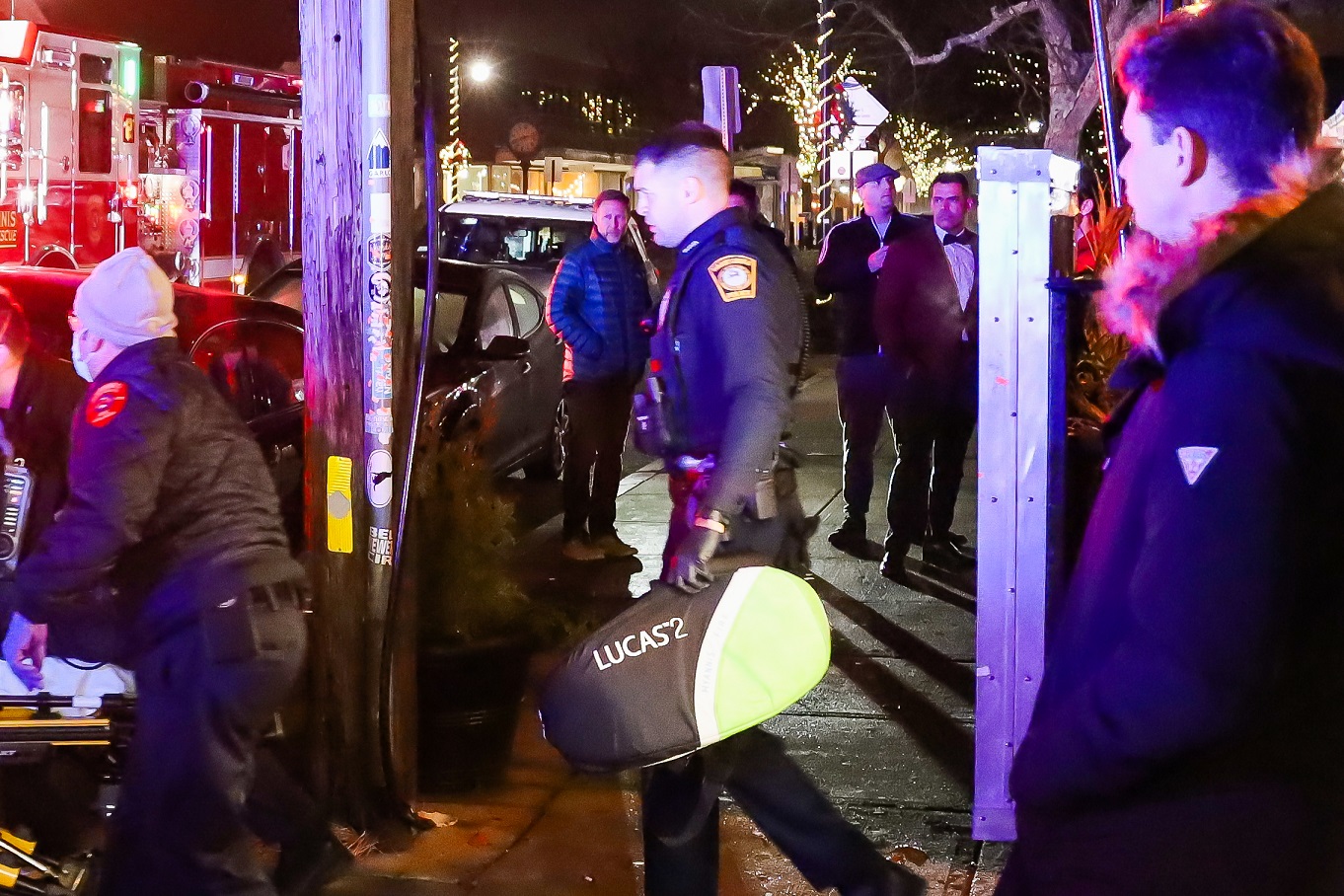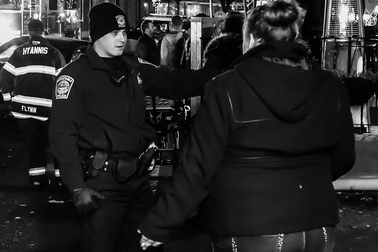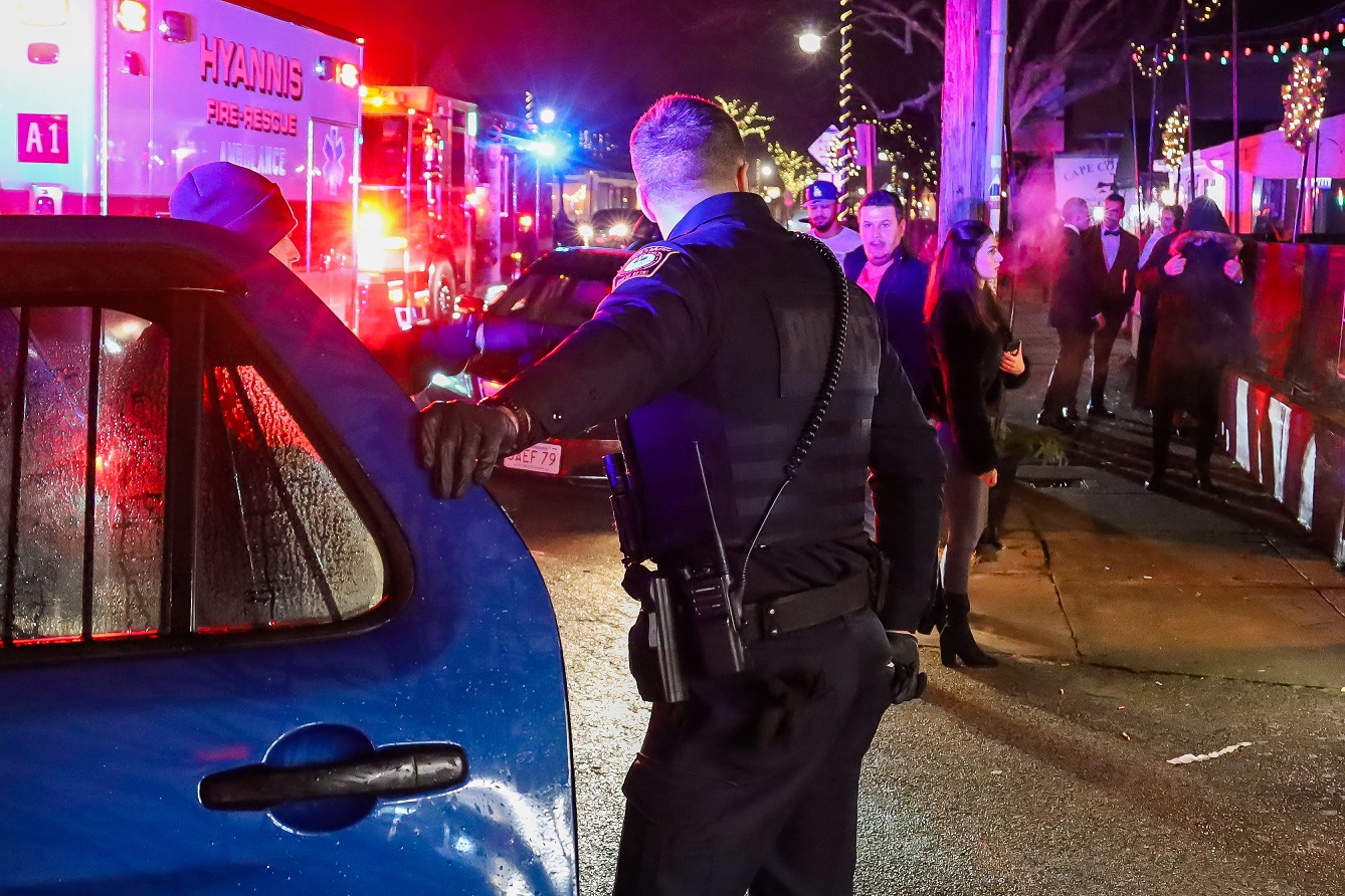 In the above photos, bystanders look on as police and EMTs rushed to a downtown nightclub in Hyannis for a nightclub staff member suffering a serious medical emergency. It happened shortly prior to closing as patrons from local establishments were emptying onto the sidewalk. Police questioned witnesses, not completely sure what may have caused the man to become unconscious. (Most witnesses were cooperative…) It was reported the patient may have been in an earlier scuffle with an unruly patron and struck his head, a short time prior to suddenly collapsing. It was an acutely distressing scene for most bystanders, especially those who knew the patient. [Additional details were unavailable at the time of this report…]