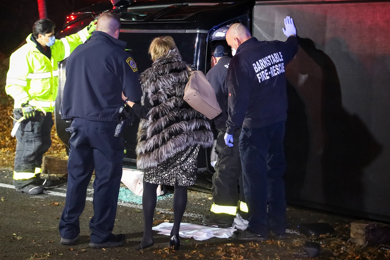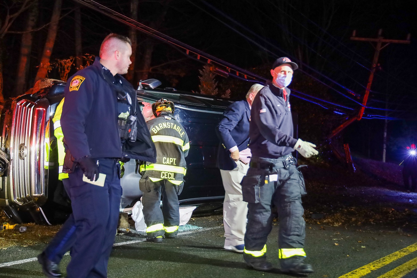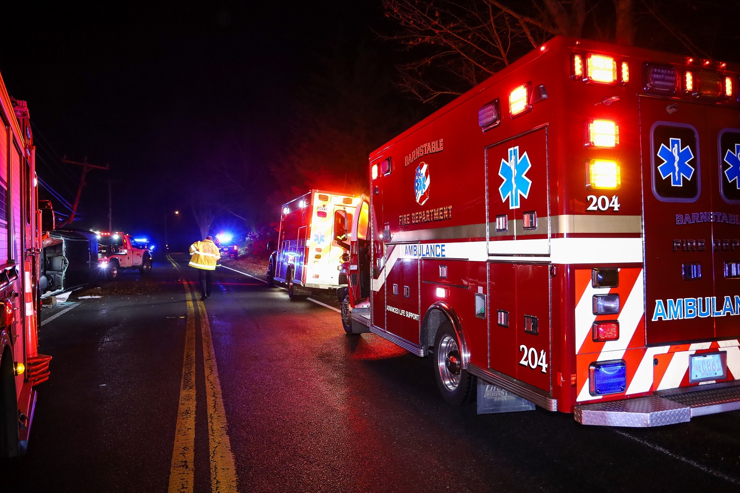 In the following photos, firefighters rescued two entrapped patients from a rollover crash. The crash happened last evening on Route 6A. A pickup truck had left the roadway and crashed through a utility pole, eventually coming to rest on its side. A windshield needed to be removed and glass broken in order to extricate a man and woman from the wreckage. Both were standing on their own with very little assistance prior to being transported to Cape Cod Hospital with injuries not considered life-threatening.