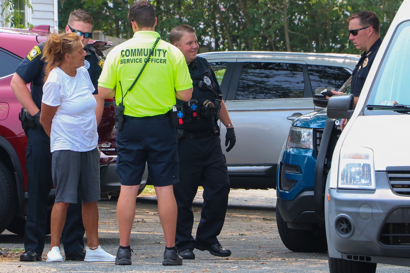 HYANNIS – This woman was being taken into protective custody in the area of Winter Street yesterday afternoon, when she appeared to blow a kiss to a Barnstable Police Sergeant.