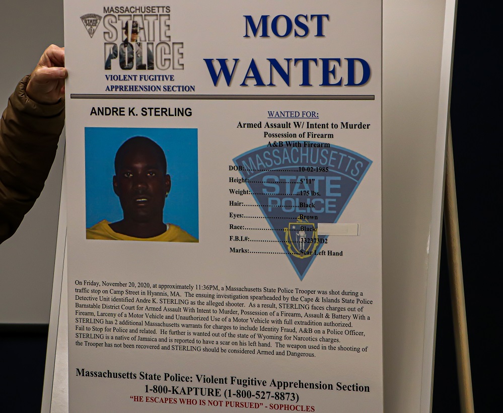 During the press conference Cape and Islands District Attorney Michael O’Keefe urged Sterling to turn himself in so that there will be no harm to the public and so “that there will be no harm that will come to Mr. Sterling if he makes the wise decision to – wherever he is – to reach out to the police department in the town wherever he is and make an arrangement to surrender himself, or certainly he could call that phone number.” The phone number that Mr. Sterling – or anyone with information on his whereabouts – is urged to call is 1-800-KAPTURE (or 1-800-527-8873).