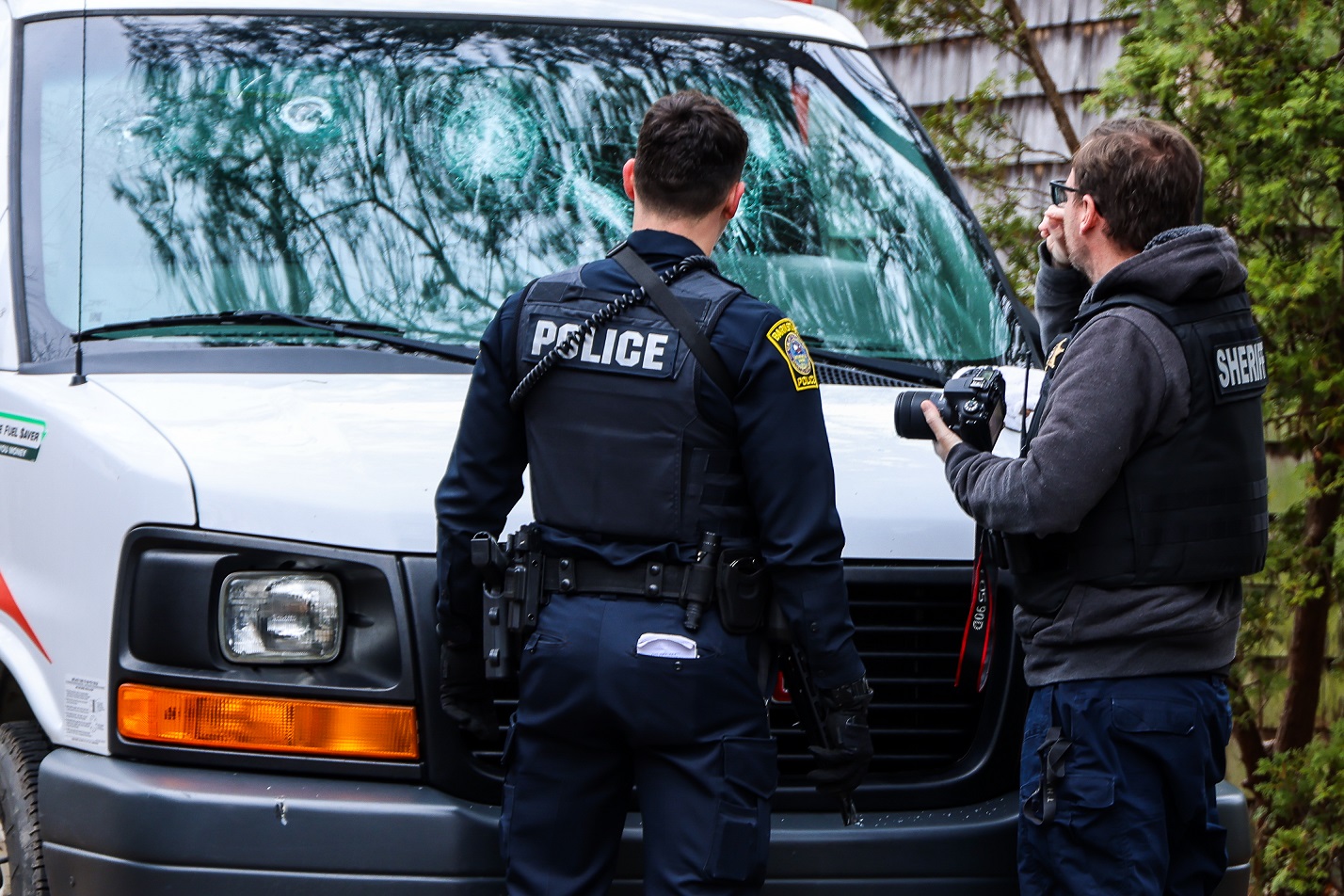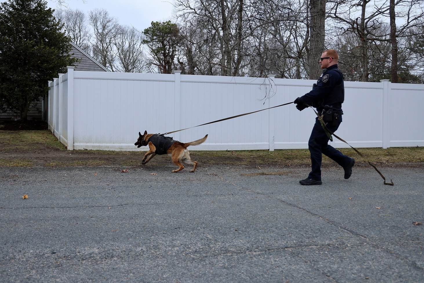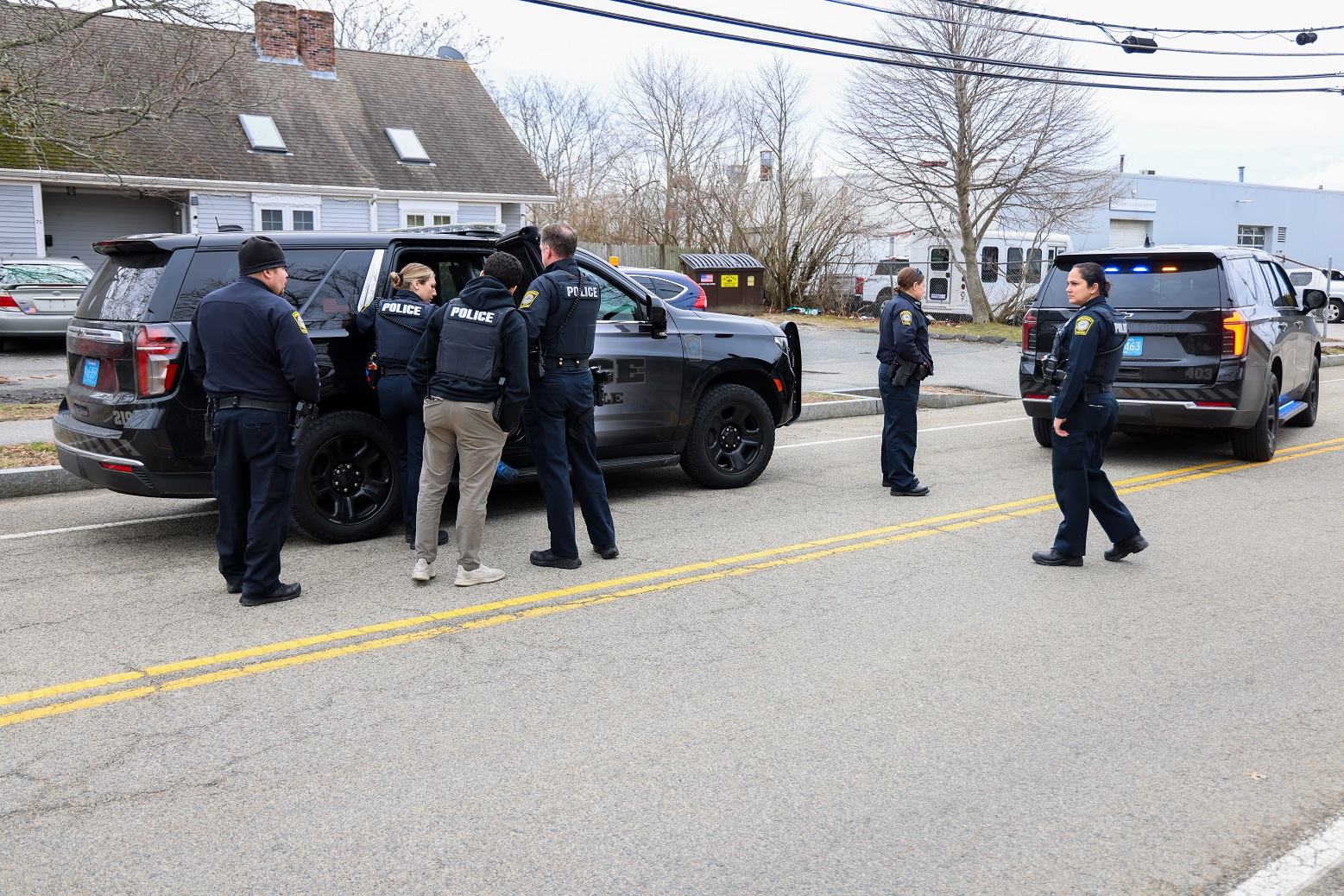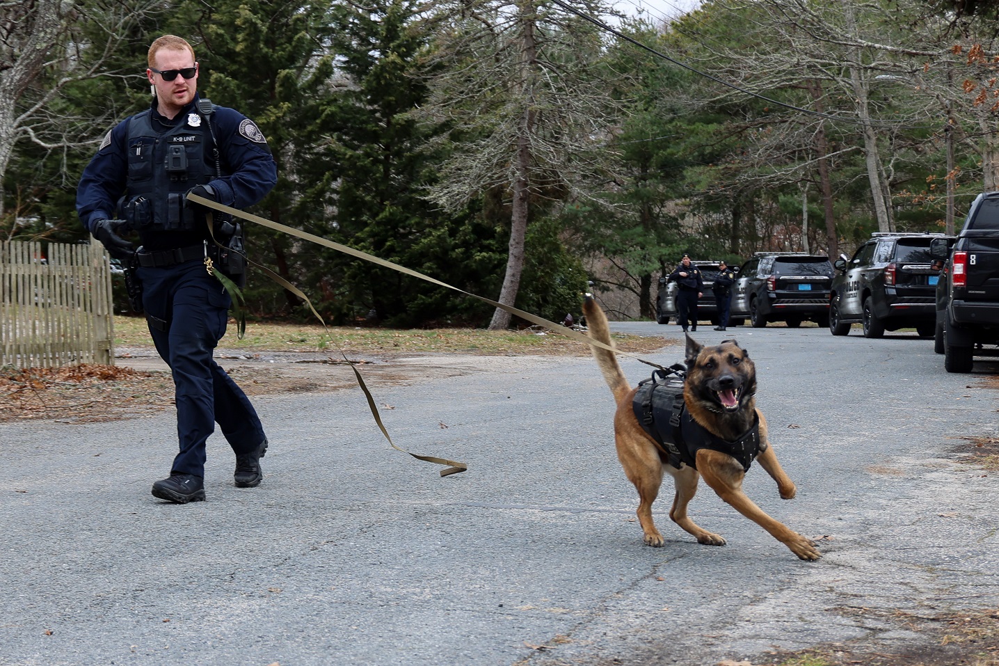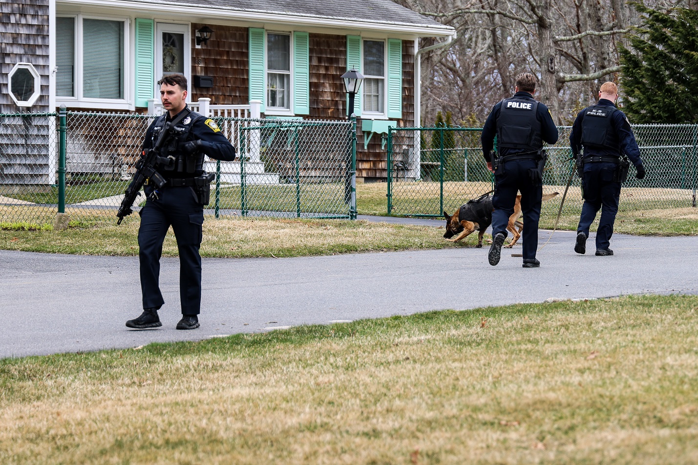 Officers wasted no time. A Yarmouth Police K-9 unit swept back yards and pushed into the wooded area near the ball fields. Barnstable units saturated nearby streets. A sheriff’s crime scene unit photographed a smashed van windshield and cleaver-sized gashes in a trailer at the scene. At least one police drone hummed overhead while the elementary school remained locked down for safety.