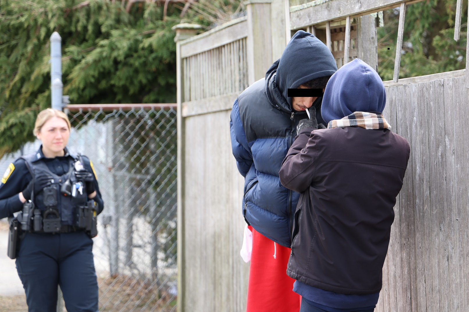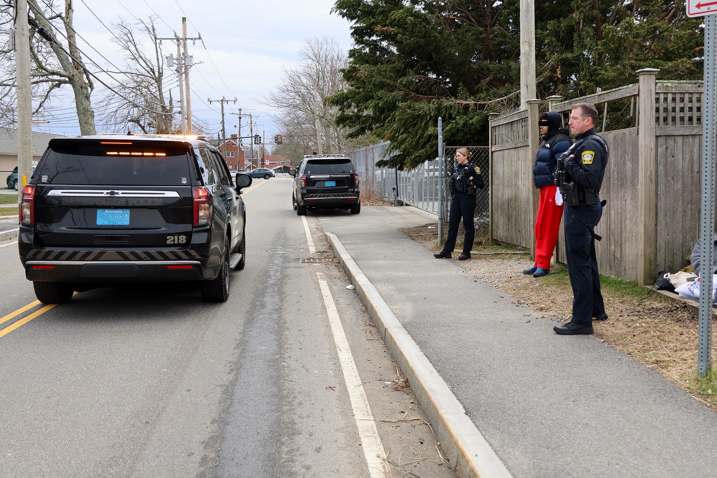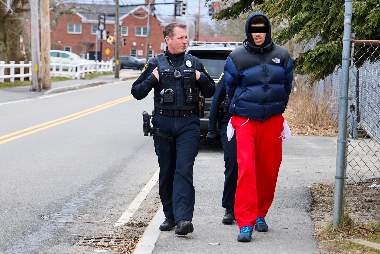 By early afternoon, officers detained a man matching the exact description near the corner of Winter Street and Stevens Street. He was placed against a fence as the alleged victim was driven past in a squad car for a positive identification. Hyannis News photos from the scene show the handcuffed man, a policewoman standing by, and a friend lighting the detainee’s cigarette.