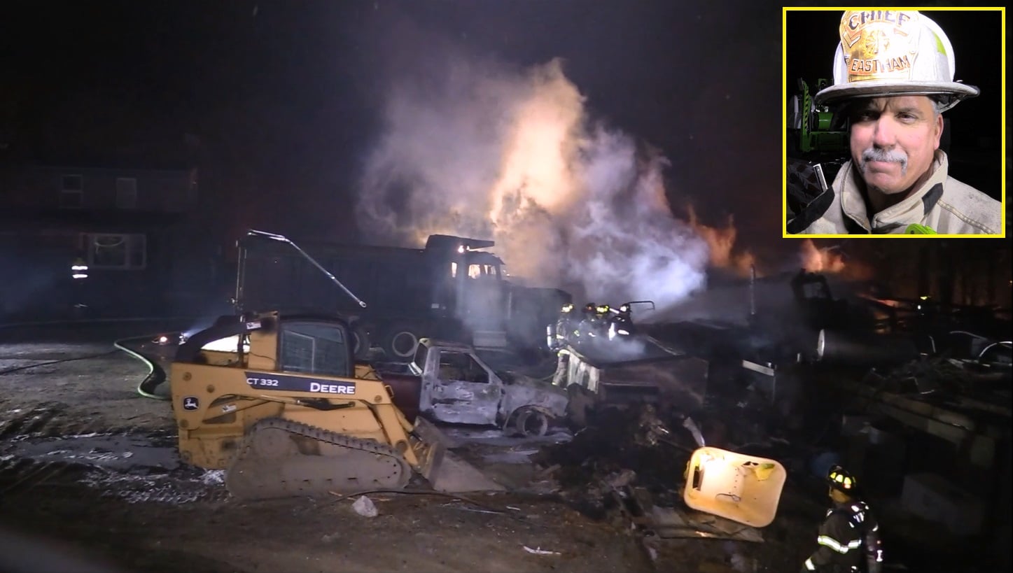 NO HYDRANTS: Firefighters tank in water to battle extensive 3 alarm fire at a Wellfleet construction company… [HN VIDEO]