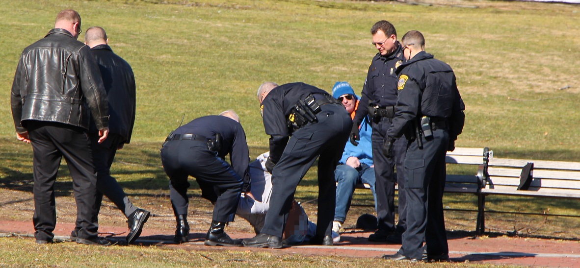 There was drama on the village green yesterday as police rushed to assist an officer with a combative homeless man.