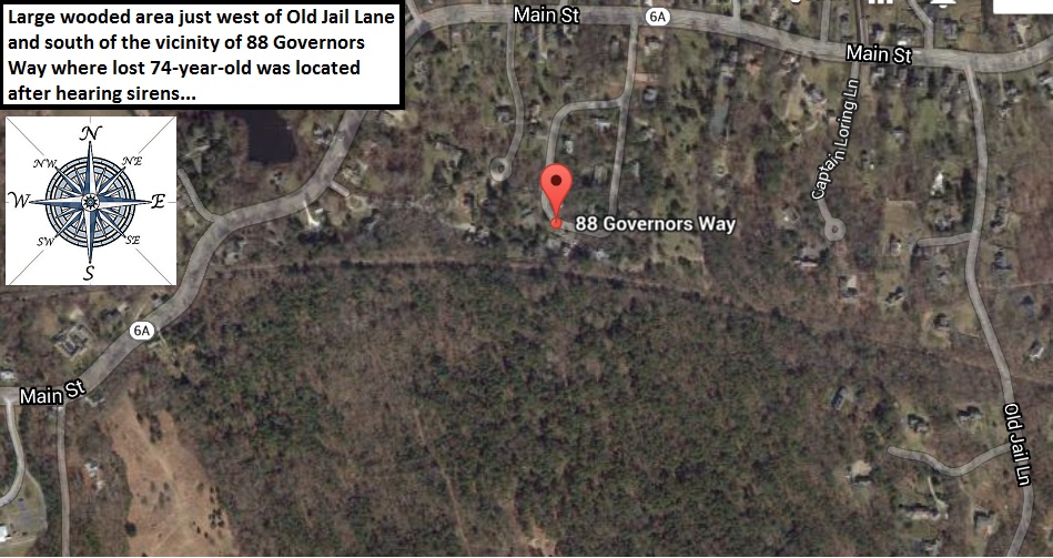 Barnstable – Just before 5pm, Barnstable Patrol Officers responded to a large wooded area just west of Old Jail Lane and south of the Lothrop Hill Cemetery after a 74-year-old man called dispatch stating he was lost.