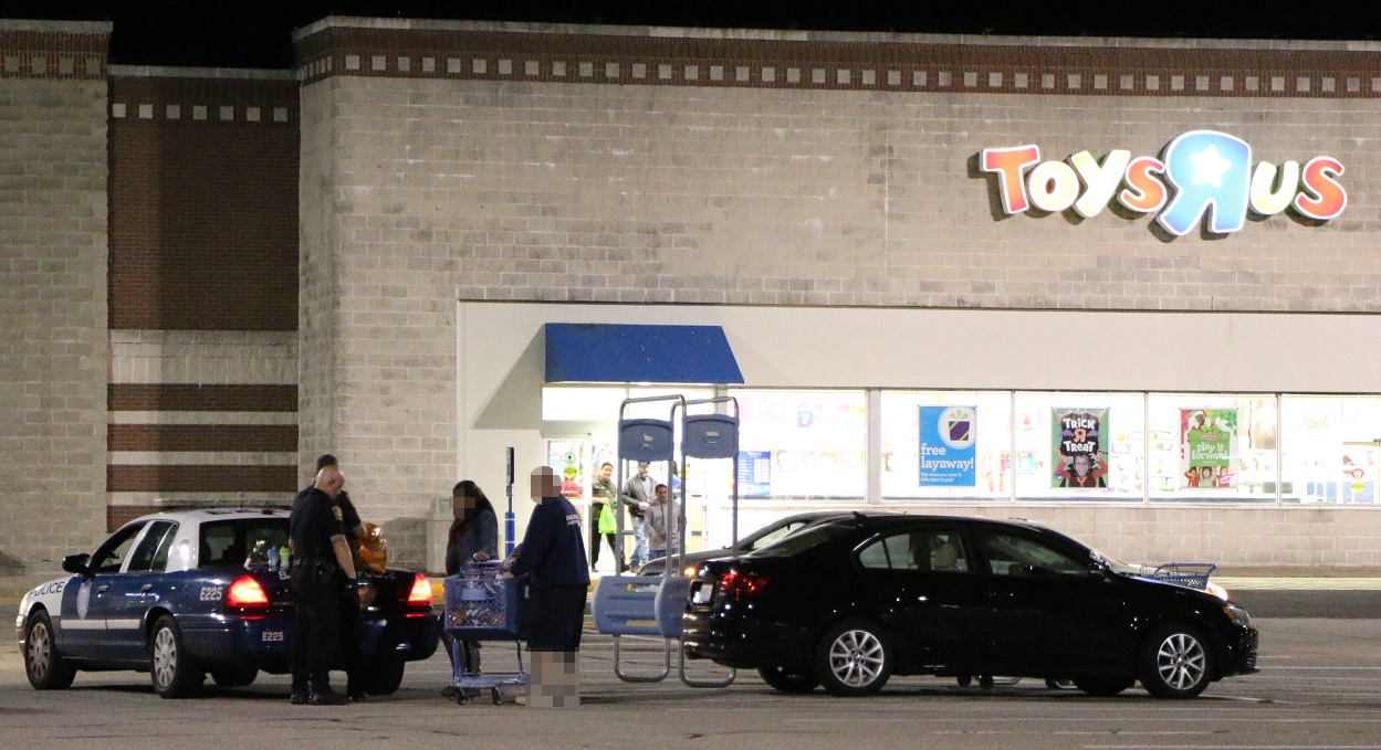 Two patrol cars responded and encountered what was described as a “very pregnant” young mother, her young child, and boyfriend in the parking lot in front of the popular toy store.