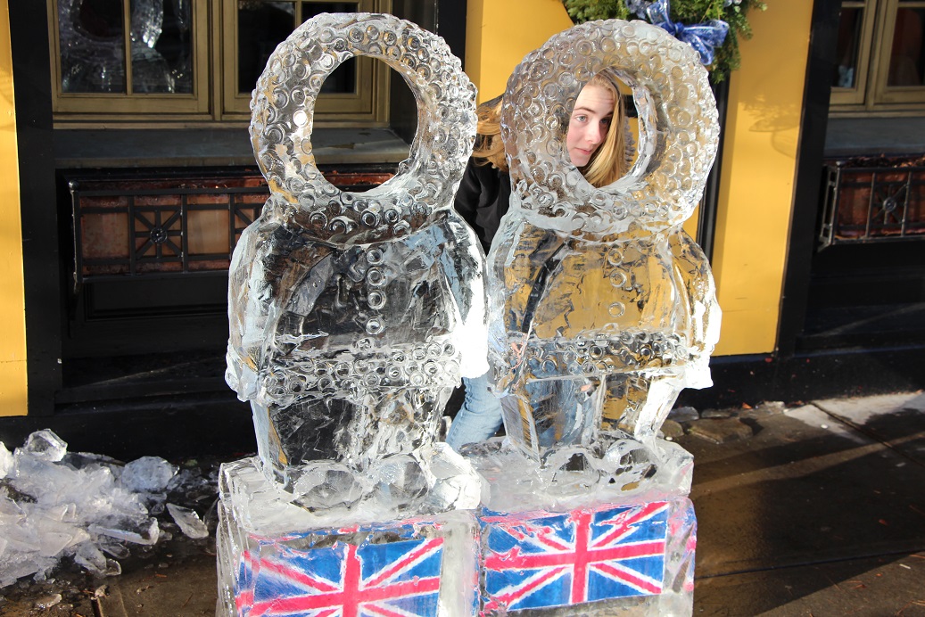 Above photo: It was kind-of a happy thing with the ice sculpture in front of the British Beer Company…