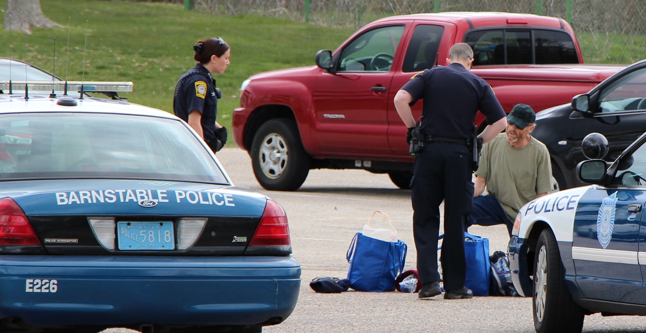 Above photo: Barnstable Patrol Officers check on the well-being of a homeless man who was said to be in and out of a wooded area in the area of West Main Street. Police routinely take time to check up on the homeless. They try to learn names and maintain friendly interactions. They do this not only to prevent potential crimes, but more so to look after these individuals who are often down on their luck and in some degree of crisis. For the most part, the homeless seem to appreciate their interactions with our local police. Many of the homeless are themselves often the victims of violent crimes or medical emergencies, and the police (along with firefighters) are often the only real “friends” these individuals have. Police also give advice, as was the case in the above photo, to help the homeless avoid situations where they may cause alarm or draw the attention to themselves. It’s a tough balancing act keeping everyone happy. Police had received a call on the above individual because someone thought he was behaving in suspicious manner…