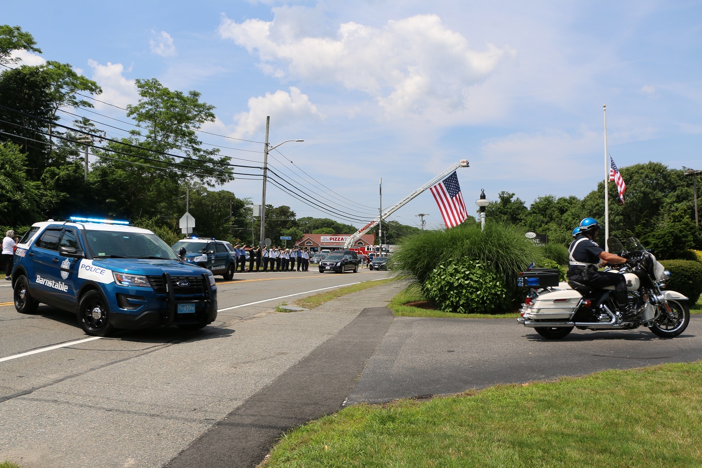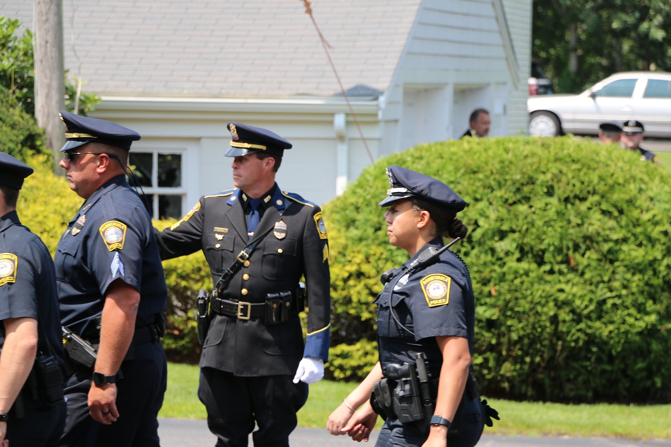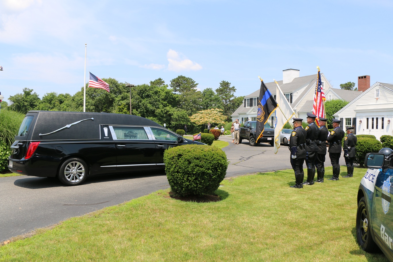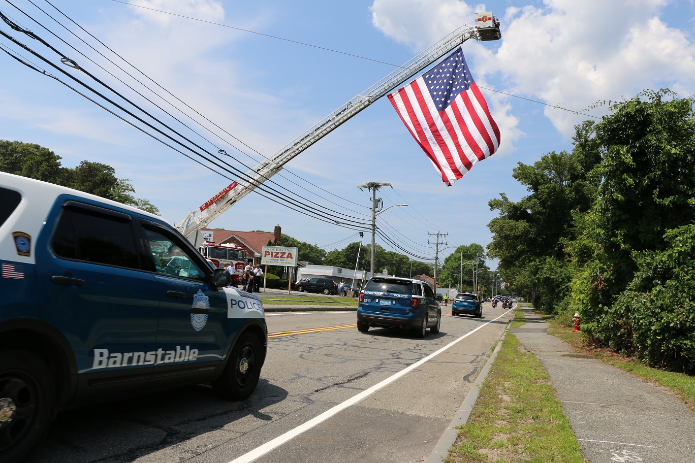 The following HN Photos show the scene today where members of the Barnstable Police Department brought the body of Sgt. Jason Sturgis back from the medical examiner’s office in Boston to the Doane, Beale & Ames funeral home on West Main Street in Hyannis. Sgt. Sturgis, a 19-year-veteran of the BPD, died unexpectedly this past Saturday evening. Sergeant Sturgis was married with three young children at the time of his sudden passing. He was just 42-years-old.