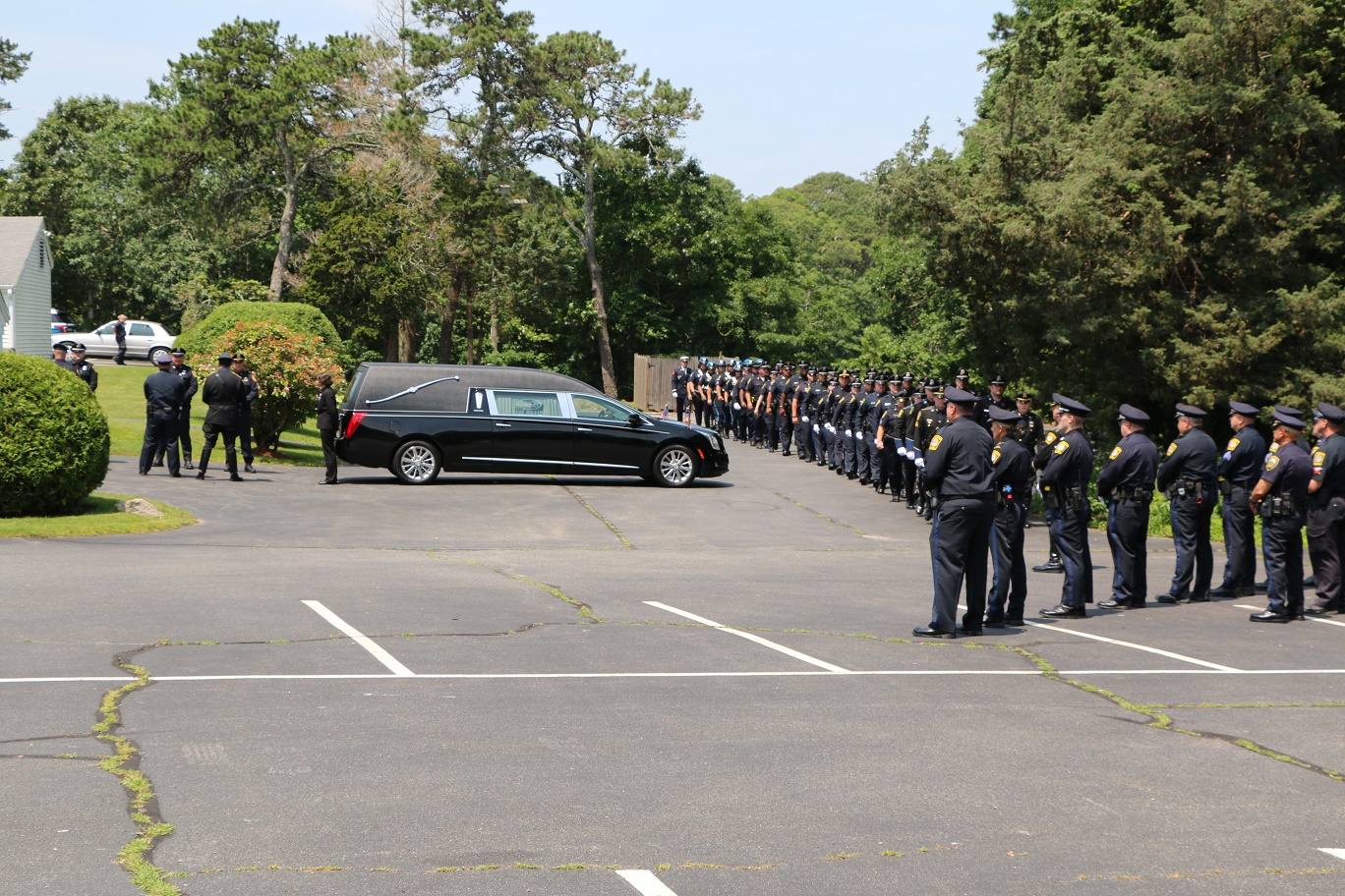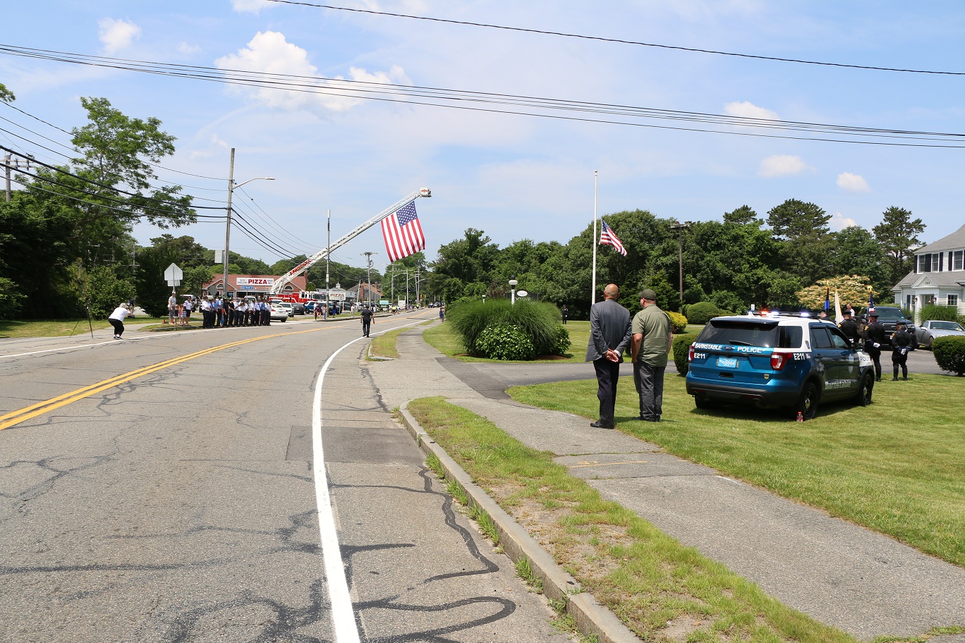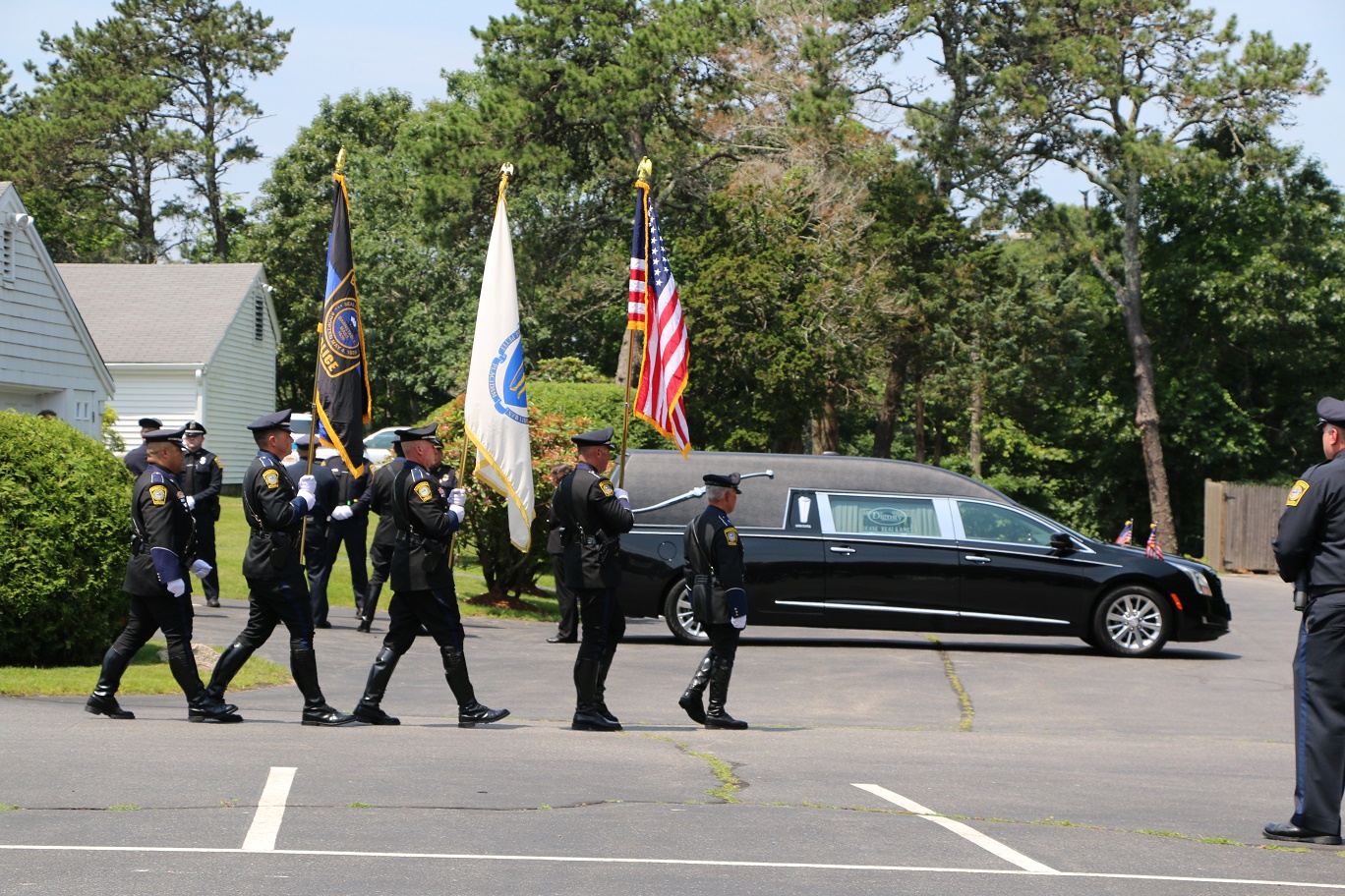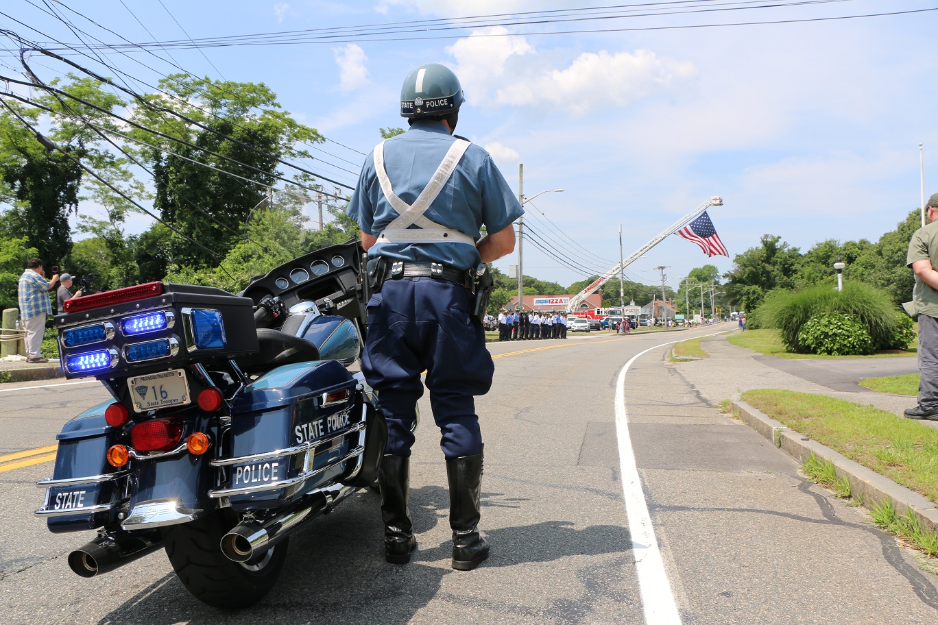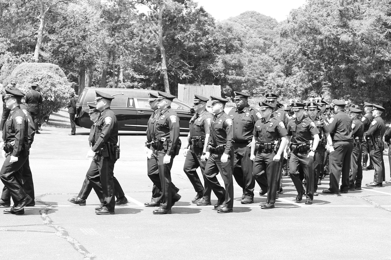 The following HN Photos show the scene today where members of the Barnstable Police Department brought the body of Sgt. Jason Sturgis back from the medical examiner’s office in Boston to the Doane, Beale & Ames funeral home on West Main Street in Hyannis. Sgt. Sturgis, a 19-year-veteran of the BPD, died unexpectedly this past Saturday evening. Sergeant Sturgis was married with three young children at the time of his sudden passing. He was just 42-years-old.