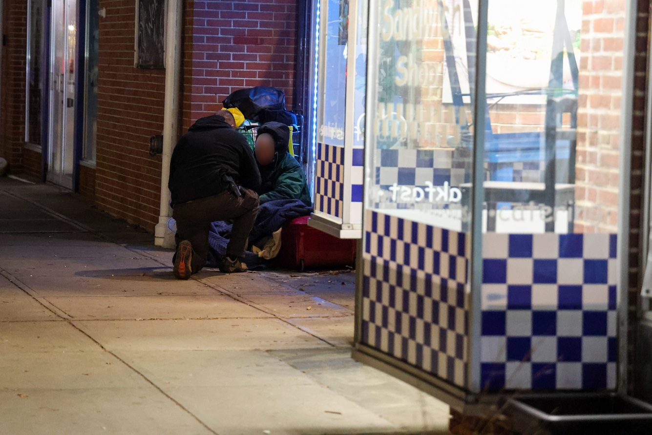 ABOVE HN PHOTO: As he was finishing with the illegal firearm caper, the aforementioned member of the Barnstable County Sheriff’s Crime Scene Investigation Unit spotted a 57-year-old homeless woman making her bed on the sidewalk, several paces from the BMW X6 traffic stop. He then went to his cruiser and returned with a new winter hat and a pair of warm gloves for the woman. He knelt down beside her and explained that the hat also has a little LED light attached, just in case she needs it. Before leaving, he told her to be sure to reach out to him whenever he’s around. Especially if she happens to need anything.