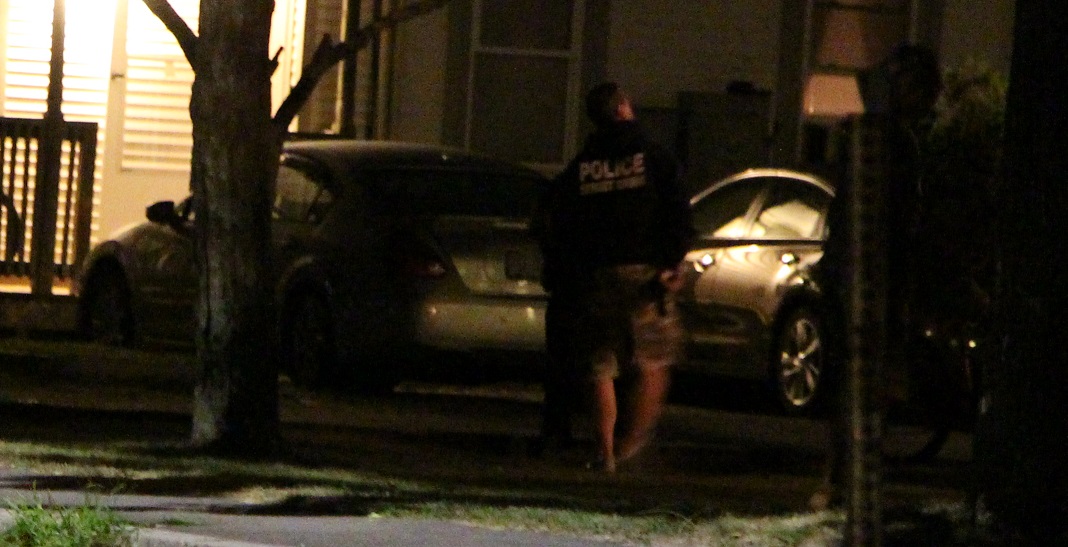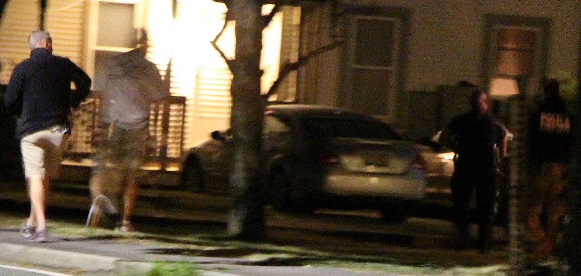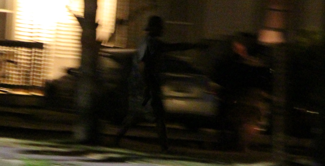 HN Note: The following snapshots where taken with hardly any light at a safe distance from behind cover… The aperture was left open just long enough to suck in ambient light… but not too long… officers are blurred because they were moving or taking safe positions like they should. Under the circumstances the image quality is excellent. Usually HN uses artificial lighting when covering moving night shots. But in this case, artificial lighting would have put the officers in danger. Likewise, getting too close could also jeopardize the officer’s approach. Please do not attempt to photograph this type of late night scene without understanding how you may be interfering with the officer’s use of the condition of darkness when there normally isn’t foot traffic… sure, you’re usually within in your rights to be on a public way or sidewalk at any time of day, but courtesy and consideration for the officers’ safety is much more important. Also, getting too close to the above situation could have officers mistake you for the suspect. Again, some of the images below were virtually in pitch darkness… taken from a far off distance…
