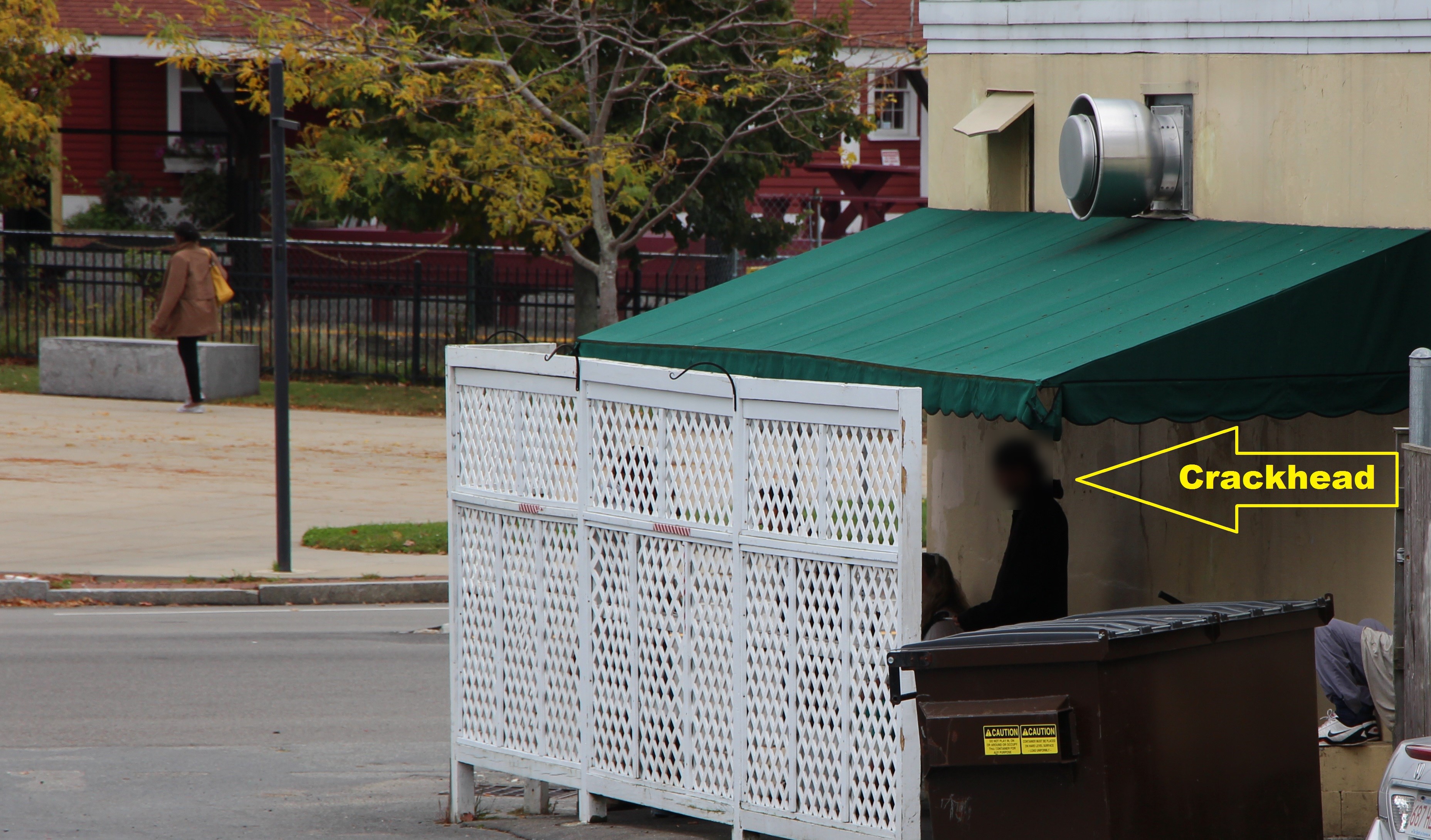 Today’s crack smoking incident is especially disturbing due to a large group of local kindergarten students visiting the nearby area. The following photo shows the youngsters seated near the entrance to the village green, just one block away from today’s crackhead… and even closer to other junkies and criminally disruptive individuals. [The image is intentionally digitized and blurred to protect the identities of the young children]