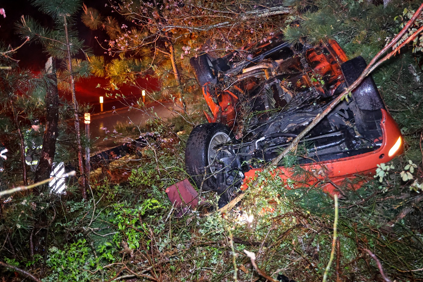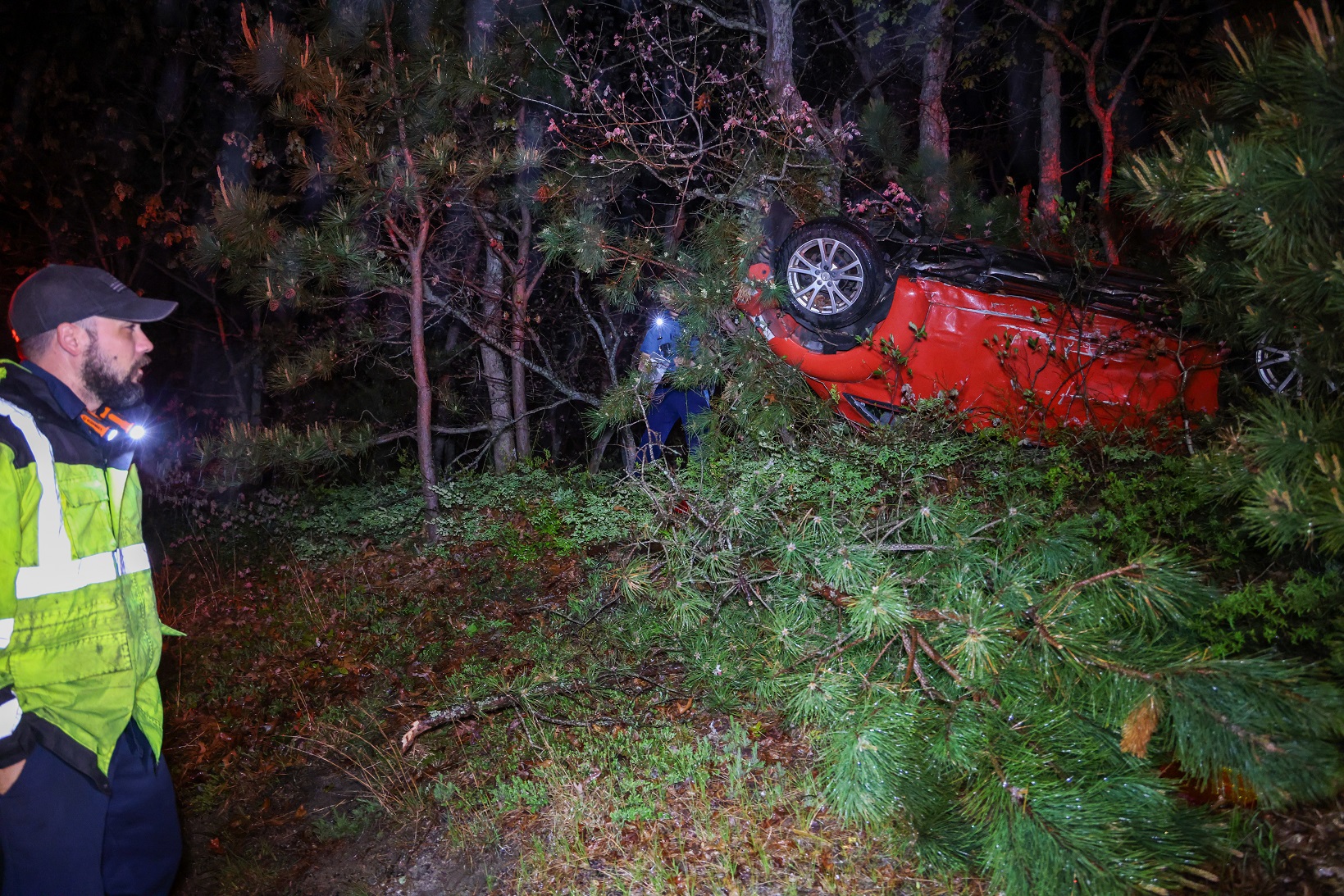HARWICH, MASSACHUSETTS – [HN PHOTO NOTES] – A state trooper and Harwich Firefighters responded to a rollover crash up an embankment and into the woods on Route 6 early this morning (in the vicinity of mile marker 83). Firefighters arrived on scene around 3:40 a.m. and found the female driver (the sole occupant) already extricated from the wreckage. EMTs inquired about the availability of MedFlight due to the violent force of the crash. MedFlight was not flying due to weather conditions. There were intermittent rains at the time. Sources and observations on scene indicated that the woman’s injuries were not believed to be life-threatening… but she definitely needed “to be seen.” She was transported to Cape Cod Hospital in a Harwich FD ambulance. The Massachusetts State Police is investigating the cause of the crash, which continued at Cape Cod Hospital…