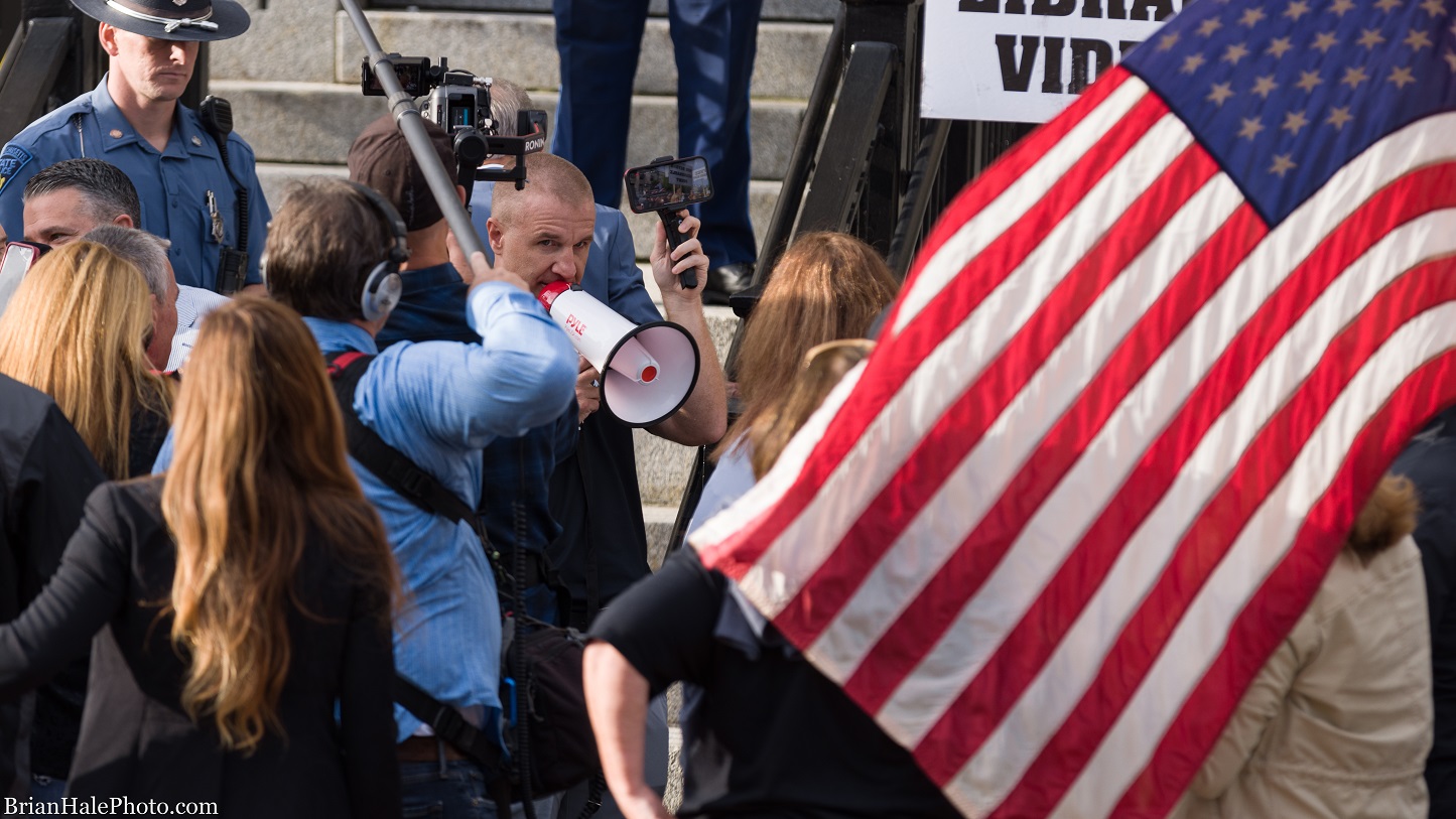 Photos: Aidan Kearney, A.K.A. “Turtleboy,” exiting Norfolk Superior Court, a “free man.” Kearney speaking from courthouse steps. Courtesy of Brian Hale Photography