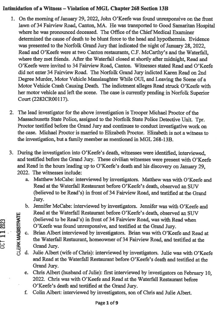 These are serious charges and I need a quality criminal defense attorney, preferably with some experience with witness intimidation and First Amendment issues. I intend on hiring the best of the best, as I do not back down from a fight. If you would like to donate to our legal defense fund you can do so by clicking here. I appreciate any and all donations, and cannot begin to describe how overwhelmed with emotions I am to see the outpouring of support I have received. This is a battle of good vs. evil. They want to silence my voice because my reporting has been too effective. Until I retain counsel and obtain legal advice I will not be doing any blogs or streams, as I am of no use to anyone if I’m incarcerated for 90 days. Thank you for understanding, because I will never stop exposing the truth, and I will never stop fighting for justice for John O’Keefe and Karen Read.”