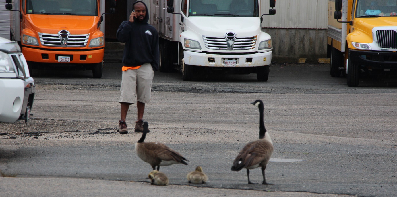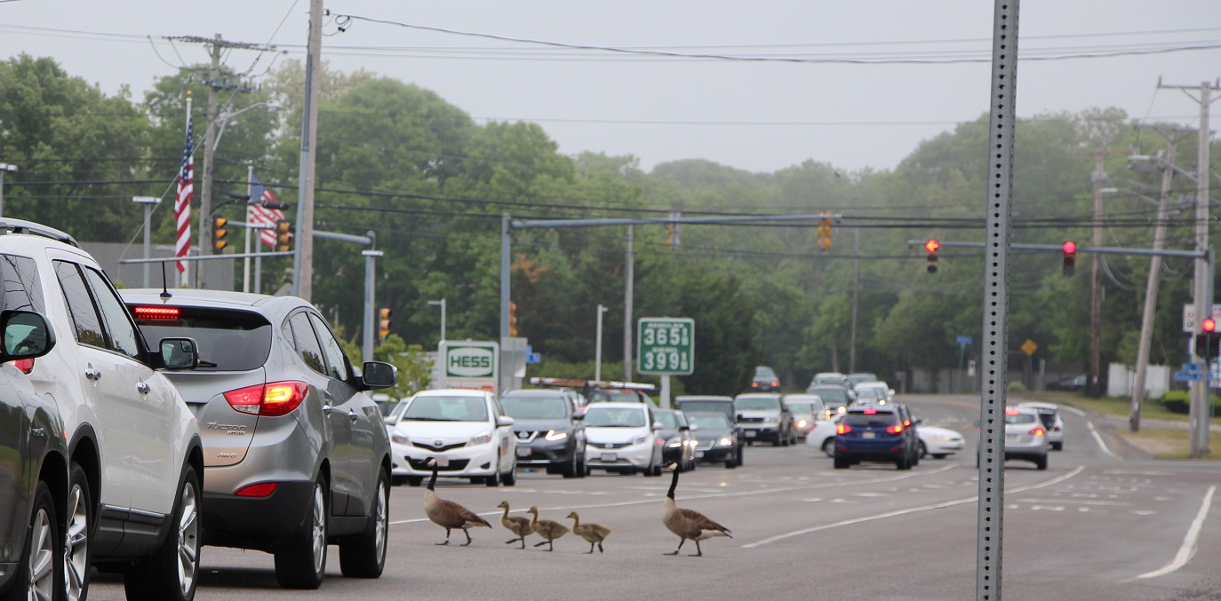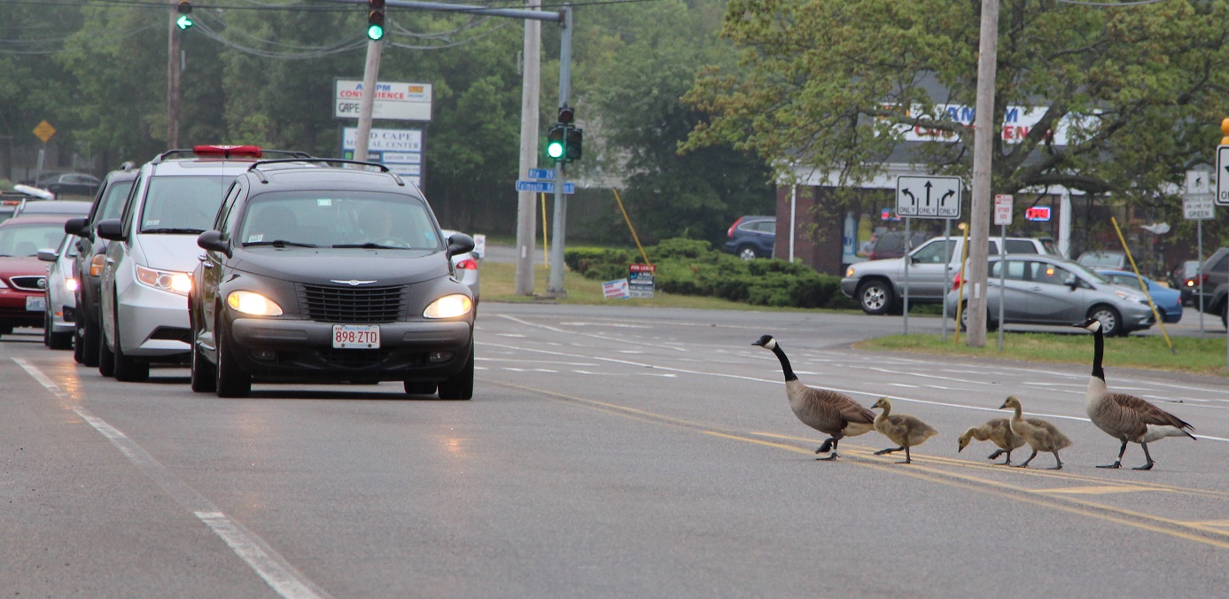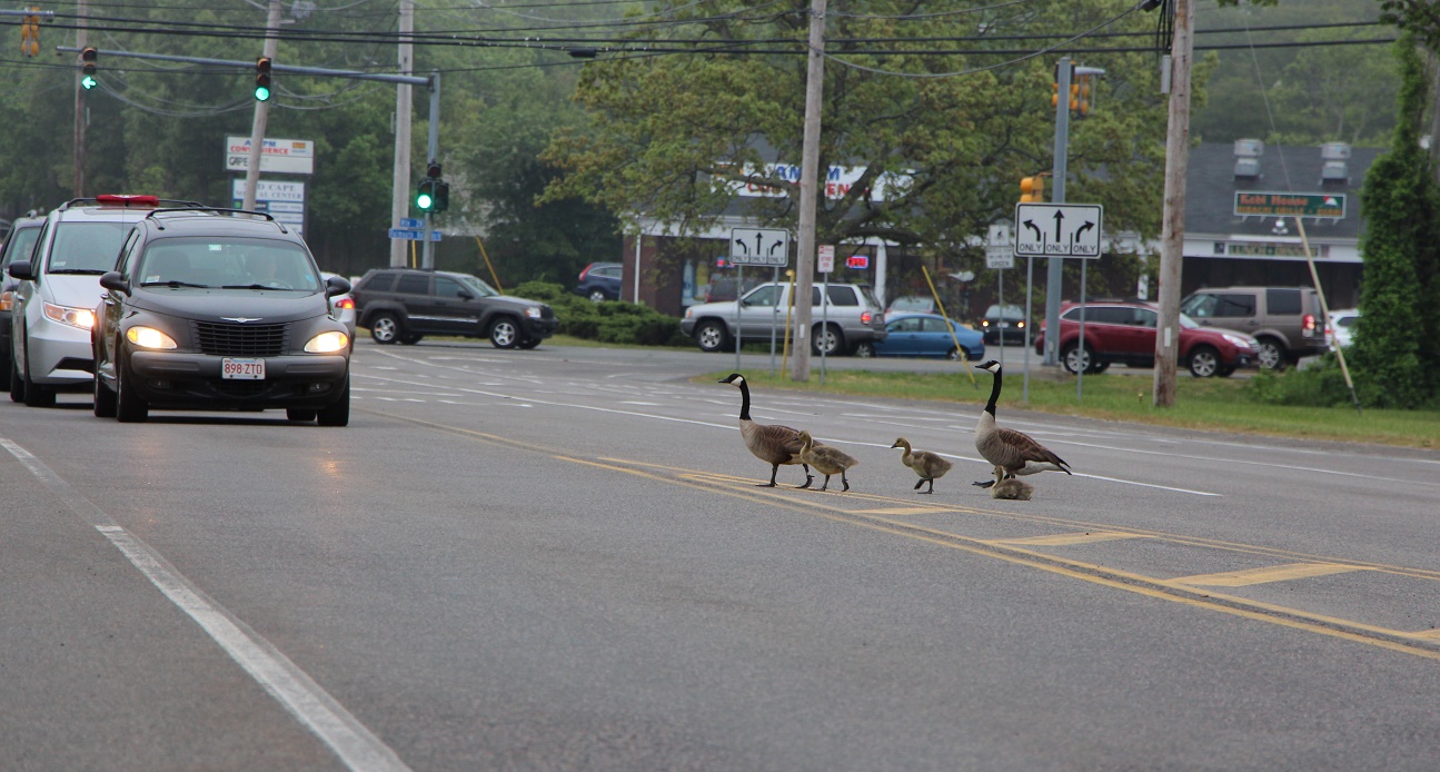 HYANNIS – This was the scene this morning when two young families of Canadian geese decided the grass was greener on the other side of Bearses Way…