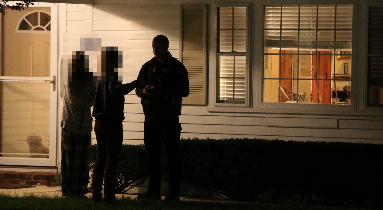 PHOTO: Patrolman Corey Frederickson listens to a mother and daughter after someone smashed in the front window of their home last evening. The incident took place at an address in Hyannis and the Barnstable Police Department is still investigating.